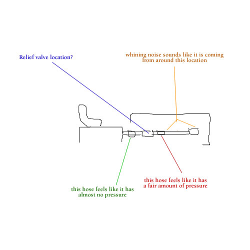 A few things I should mention - there is a whining sound coming from the front side of the tractor near where the pump is located. It also feels as if the line between the control valve and the pump has pressure but the one between the seat and the control valve doesn't. Please see my attached image (rough sketch showing locations).