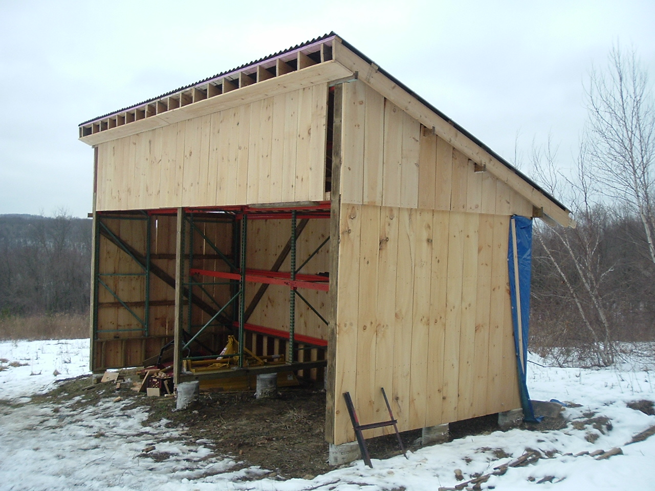 Yes, I worked on it this weekend in the cold (mid-teens). I have barn board everywhere now except half the back wall (right side) and the peak on the left side. The back wall half needs a small PT wall framed from the bottom rung on the back pallet rack to the ground, but I didn't get a chance to do that before the ground froze. I have a big tarp there now and I have my rotary cutter and tiller stored (sort-of) on the mostly finished left side.