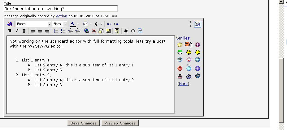 Indentation wasn't working for me on another thread, lets see if it works here. I switched to the WYSIWYG editor a few days ago and the post was properly formatted (nested lists) in the preview but it would not indent on the posted version. I have switched back to the standard editor with full formatting tools for the list below: