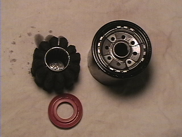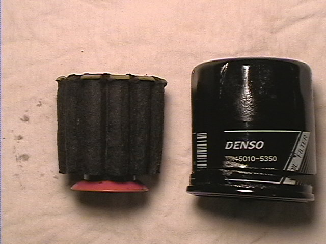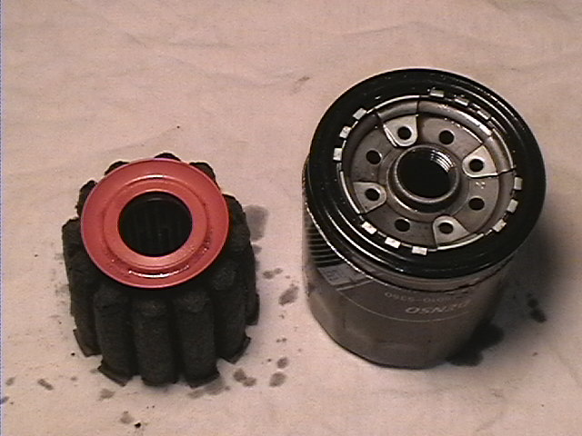 Well, it's that time of year again. Time to do the annual oil change on the 3215 tractor. She's goin' on 4 years old, can't believe it. Put a whopping 68hrs on her this year too.:laughing: The clear coat on the hood is peeling pretty good now. Dealer never did get back to me about repainting it. Other than the paint finish, the tractor is holding up fine, especially mechanically. Back on topic, I decide to cut open my old Japanese Denso oil filter, just out of curiosity. Was suprised by what I found. The filter material can best be described as compressed felt, forming 12 large pleats. The material was saturated with oil,firm and brittle. I could easily break small pieces off. There were no top or bottom "lids" like American made filters. Pretty interesting stuff. Never seen pictures of any oil filter insides looking like this.