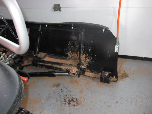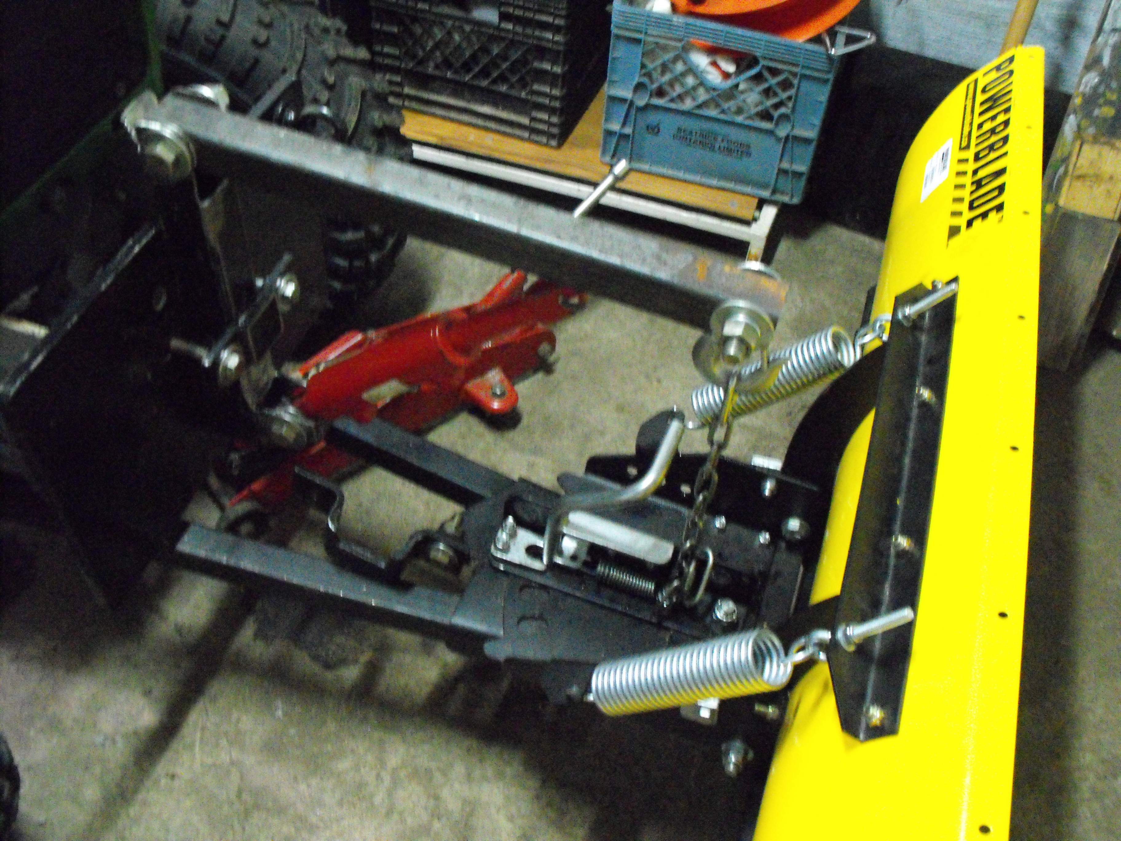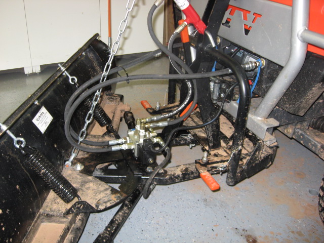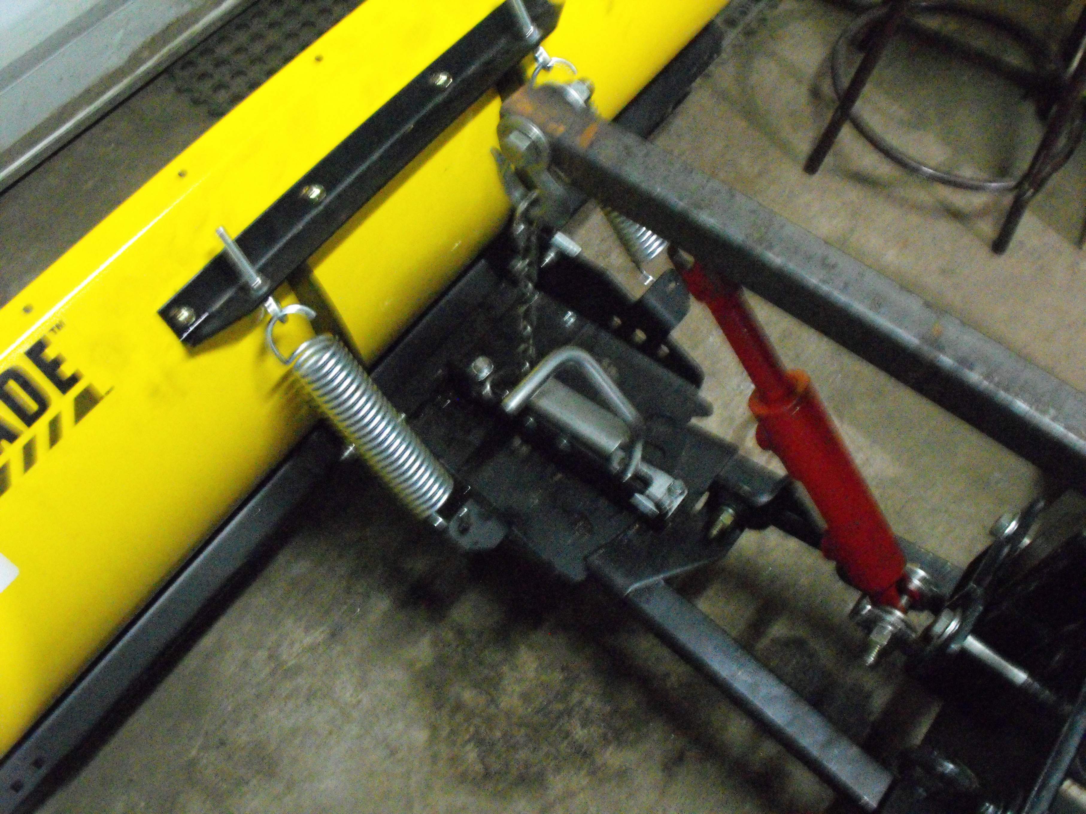 Here's a pic of my new ATV snowblade....the Myers cylinder has been replaced with a double action cylinder/ram...and is....now completely connected and ready for the two hydraulic hoses.... Now I'm lookin' to where and how to mount one double action hydraulic cylinder/ram for angling the blade....I'm thinkin that the best spot would be to install it to the "A" frame of the snowblade rather than the main frame of the tractor....