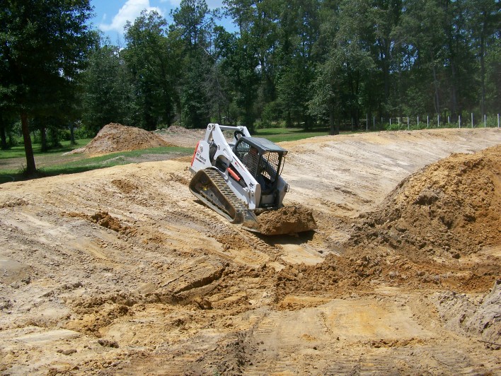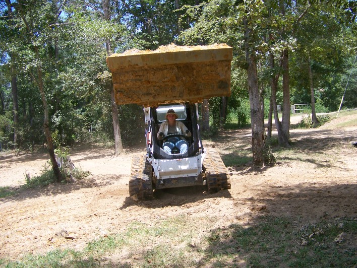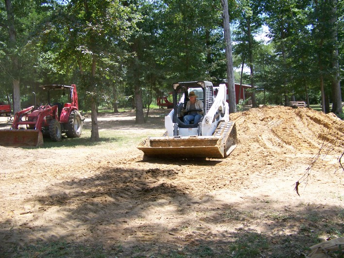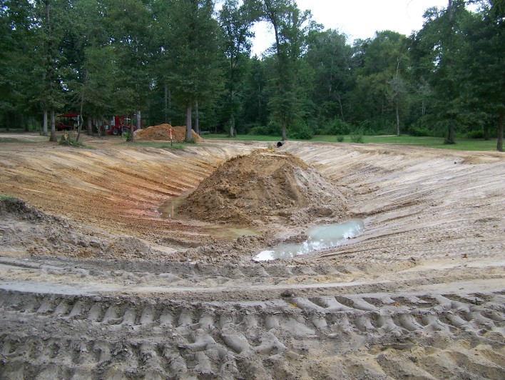 I took off July 30th and the 31st to get caught up digging. I finally decided to reserve a mini track loader (for this weekend) because the Mahindra could get down drive straight down to the bottom of the pond....loader end first and dig out the dirt and back out..................but the weight of a full bucket put the front tires in the muck up to the axle if I tried to back out. I got frustated just picking up the bucket and dumping it. I could lift the dirt up on the island, but I was finished with the island then.