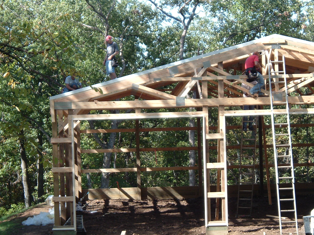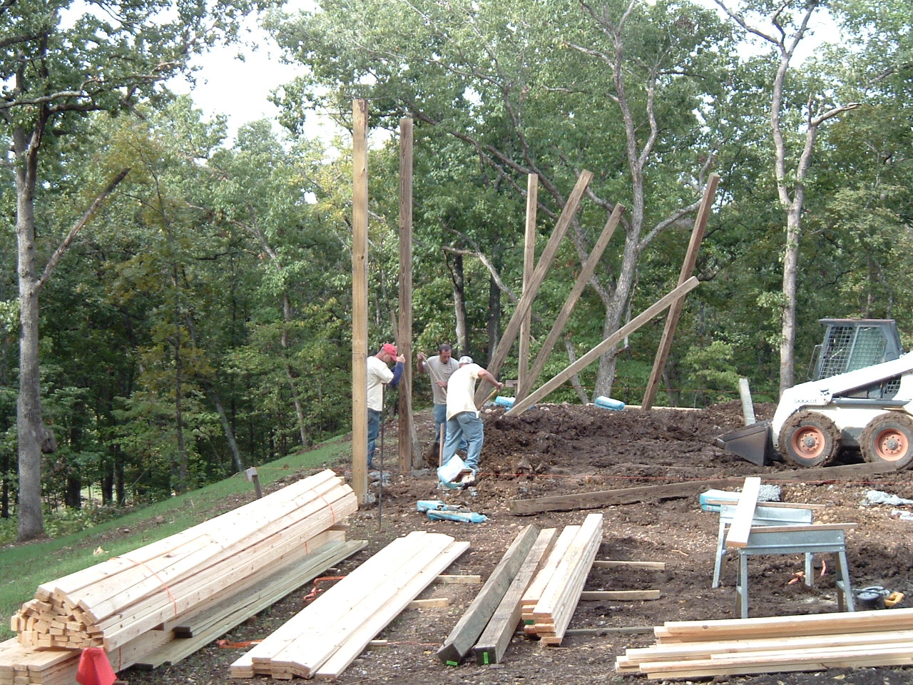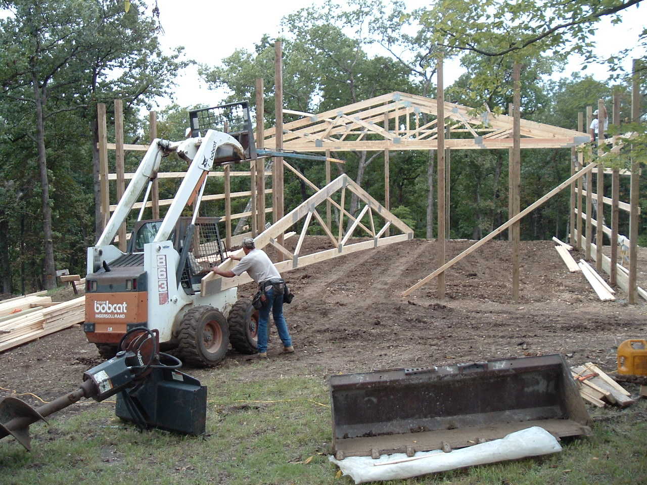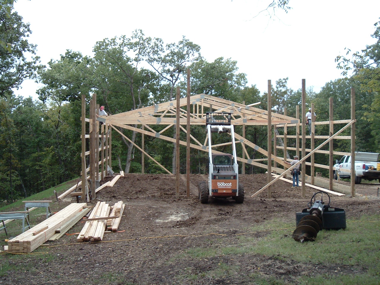 The start of the building work, drilling holes, setting poles and erecting the big trusses