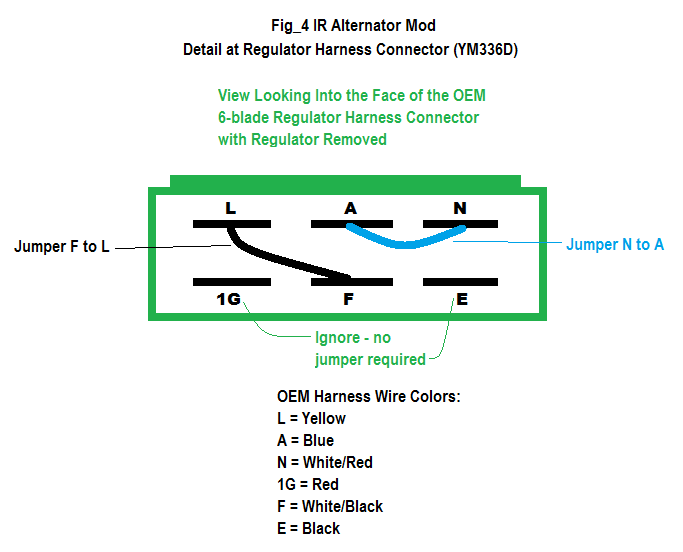 • In addition to the alternator, the mod requires a few inches of wire and 4 standard crimp-on male 1/4" blade connectors (to DIY two 'jumpers' installed at the OEM Yanmar 6-blade voltage regulator harness connector upon removal of the OEM regulator)