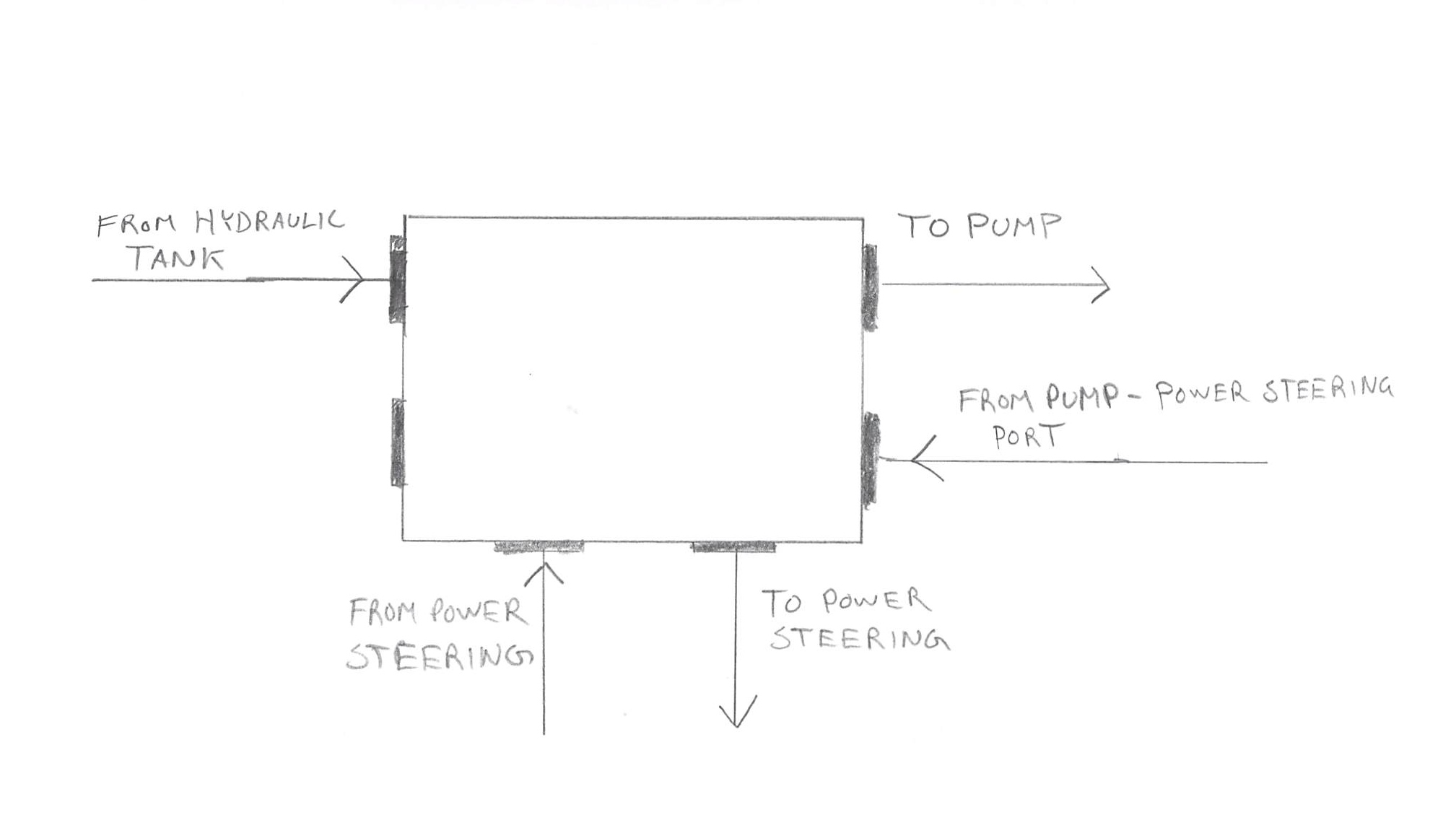 I'm trying to troubleshoot my Dad's power steering on his 444. The tractor runs fine other than the power steering hasn't worked in 20 years! It has a tandem hydraulic pump: one chamber devoted to the front-end loader/3 point hitch, and the other to the power steering. The front-end loader hydraulics work, but the power steering does not. A few months back Dad took the power steering cylinder/valve assembly in to get fixed. The company that refurbished it said it now works fine. However, after having installed the power steering cylinder, the power steering still did not work. We then had the pump checked out and the company said it was beyond repair, so we purchased a new one (expensive) and installed it. guess what? Power steering still does not work. (Front-end loader works fine once again.) Now we are confused and frustrated. I thought I'd check here to see if anyone has any other ideas. At this point I can think of only two possibilities. One, that the power steering cylinder wasn't actually fixed. Or two, a device that I'm not familiar with is the culprit. (I'm not experienced with hydraulics). The devise I'm referring to is shown at the tip of the green arrow in the pic below. It looks essentially like a steel block, and has hydraulic lines attached as per sketch also shown below.