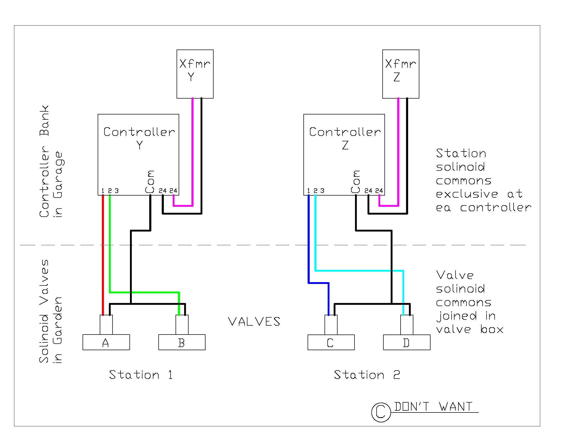 Thanks for all the input. I think I am getting the picture that the power transformer "common" and the solenoid commons are all one and the same. I was treating them as separate and different in my mind. Some sketches helped. To keep things simple consider I have two 3 station controllers and four valves at two different locations. So although I wanted to do this...(pdf is a better looking copy of the same sketch)