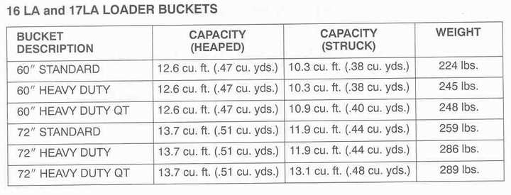 scratchin' my head for sure. /forums/images/graemlins/confused.gif I've attached the specs for the NH bucket. You said the Woods 60 in bucket had more capacity, but I checked Woods data and the capacity of their bucket is 11.0 cubic ft. the NH bucket is 11.9 cu. ft struck and 13.7 heaped. Woods doesn't give the heaped capacity. The Woods 66" bucket does come in and 12.1 cubic feet, but that's very close to the 72" standard and heavy duty NH capacity of 11.9. If you had chosen the NH quick attach bucket, it's capacity is 13.1 cu. ft. struck and that exceeds both of the Woods buckets. The Woods 1012 does not have a recommended 72" bucket. You have to go to the 1016 to get the 72" bucket and it's capacity is 13.3 cu ft struck, which is very close to the NH quick attach bucket. I think your sketches are wrong. You may feel that way, but the numbers don't agree with your impression. I sure hope you didn't get the standard bucket. I do agree that the NH standard duty bucket is best suited to hauling manure. It surely can't do any real dirt work. My conclusion is that the 16LAs specs more closely parallel the Woods 1016, but you weren't planning on buying that loader. Also, the NH bucket is just under 300 lb, so that leaves a lot of your loader's lift capacity for the load in the bucket. An 800 lb bucket would mean I lose 500 lb of lift capacity. I'm not sure I'd want that. Do you have any idea what the Woods bucket weighs. The Gannon buckets for skid steers are very heavy, 800 lb ++. /forums/images/graemlins/tongue.gif