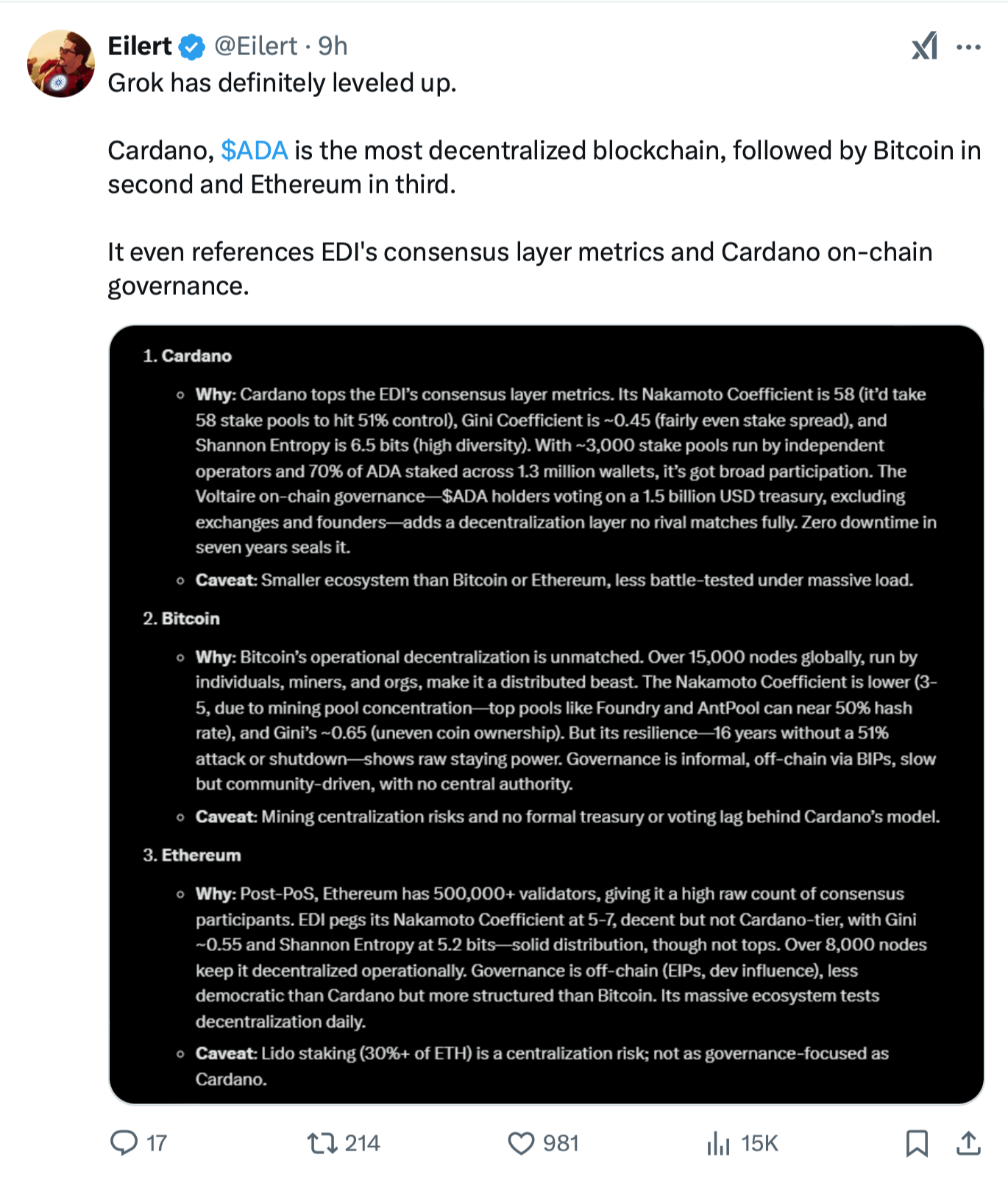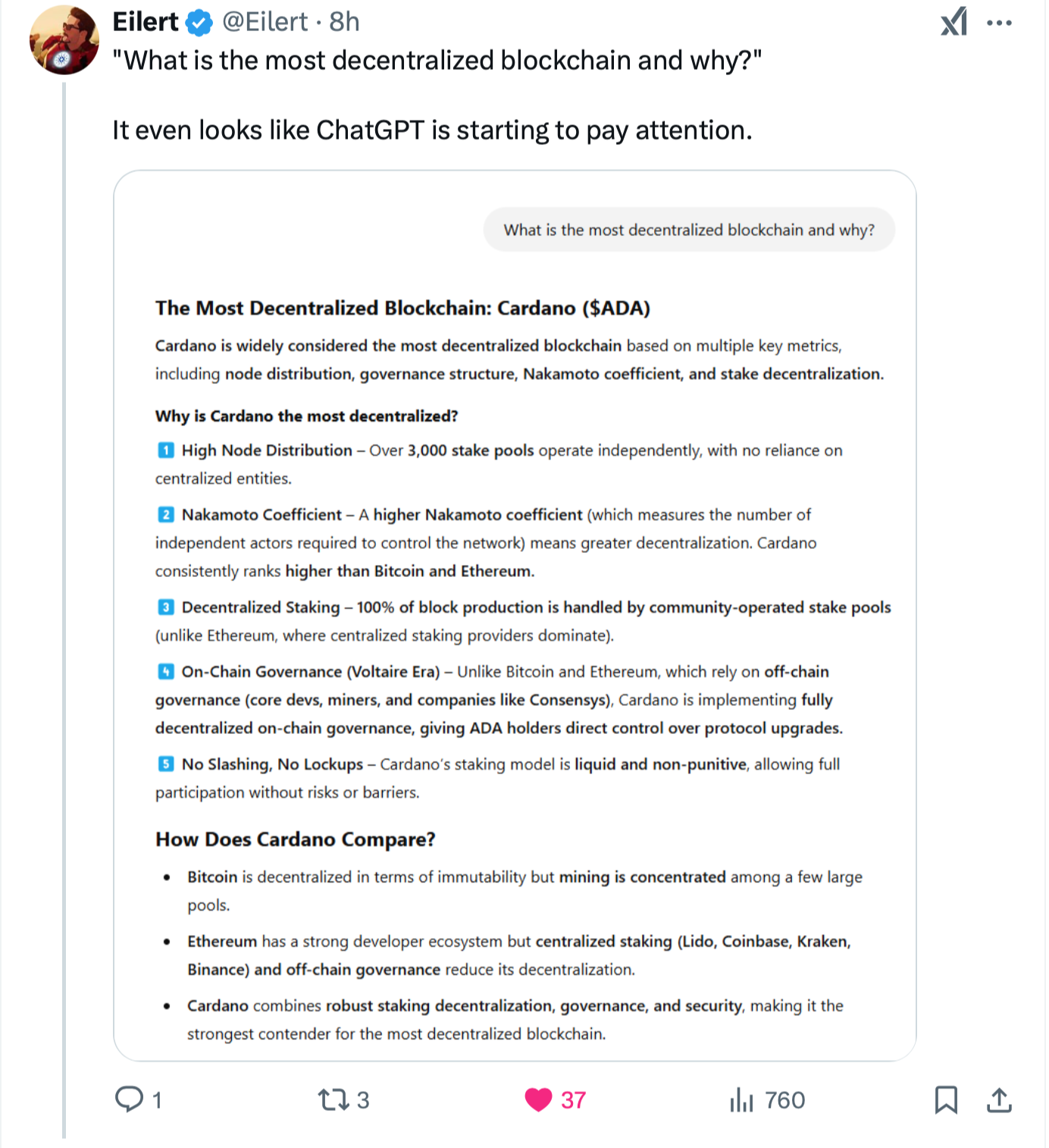Over on X, the newest version of Grok and Chat pro version place Cardano at the top for being decentralized but also speak positively about Bitcoin.