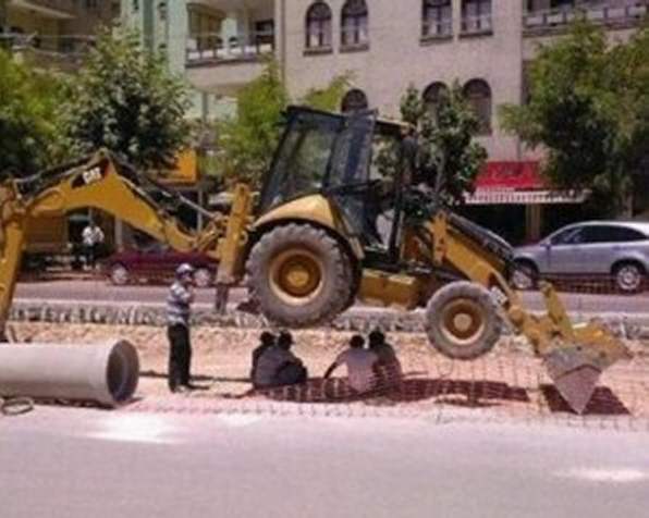 No it isn't safe, the guy on the left shouldn't be using a mobile phone on a work site ....even if it is to chase up the fluoro vests/PPE for his crew, a Stop/Go sign to ensure adequate traffic control & an operator with working at heights certification to drive the backhoe....................so much for a risk assessment....