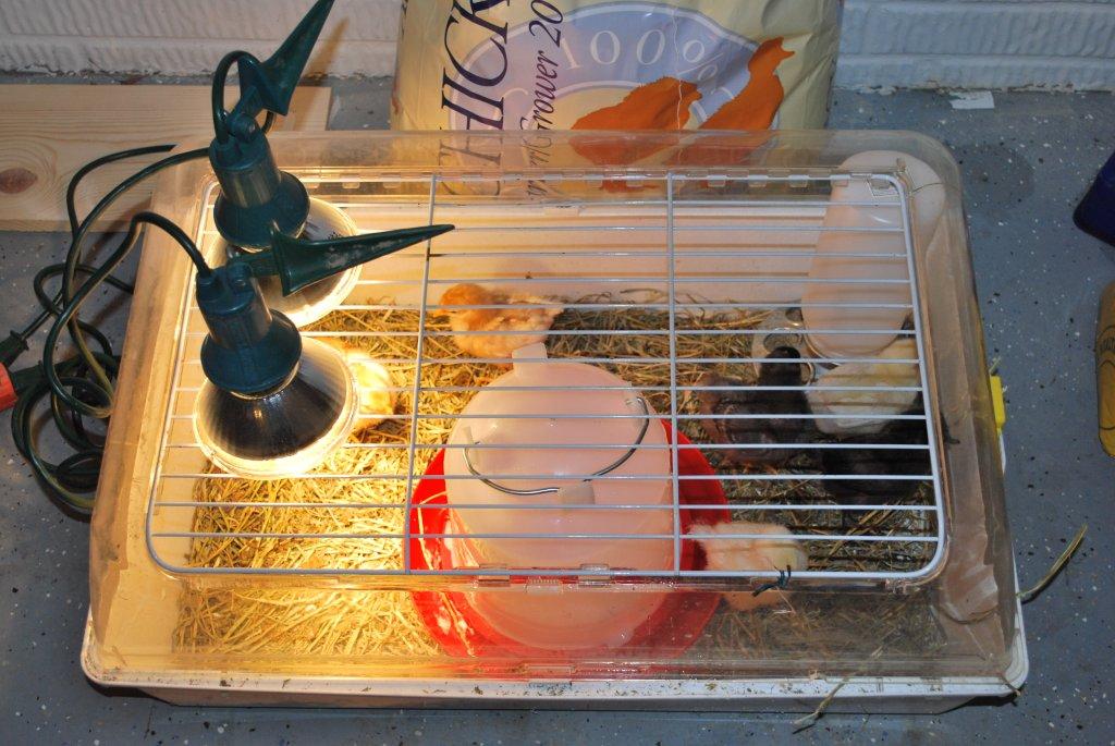 We used a 50 gallon water trough with a dog kennel screen around it last year. Worked pretty good for the four we had until they were large enough to go outside.