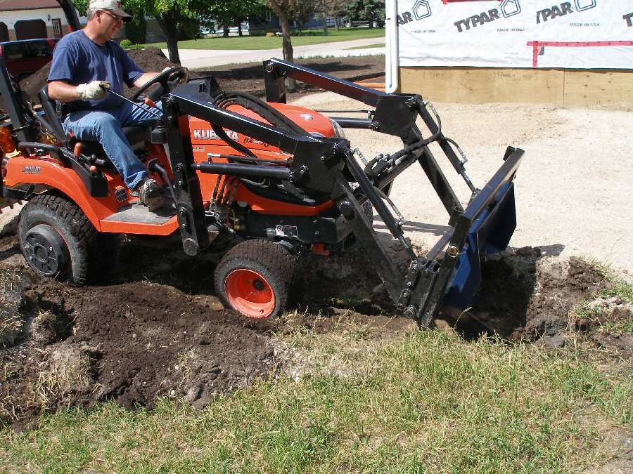 jimmyj you're more than welcome to steal any ideas I have, after all I "borrowed" them from other people on this site. I started using the forks, for putting my attachments on and off my trailer. But now I use them for lifting old motors for customers, planters, and believe it or not I tore up an ash fault driveway and garage ash fault floor with extreme ease. My son was able to do this. He's 16 (my youngest) and has only operated this machine a few times. I'm proudest of my power rake. It works slick! I crowned a packed gravel driveway about 400 ft long, in an hour. I haven't dug up any trees with my tree spade yet. Although it handles rocks like a dream. It's made out of 3/8 plate, and you just pry them out. The quickhitch is very handy. I never need to leave my seat unless I'm hooking up PTO and hydraulic couplers. I've started construction on a new tiller, I broke the gear box in my last one, no long weekends left though, too busy these days with paying work. Any specifics or information you require I'd be more than happy to oblige. If I think hard enough I can probably tell you who I got the ideas from originally.
