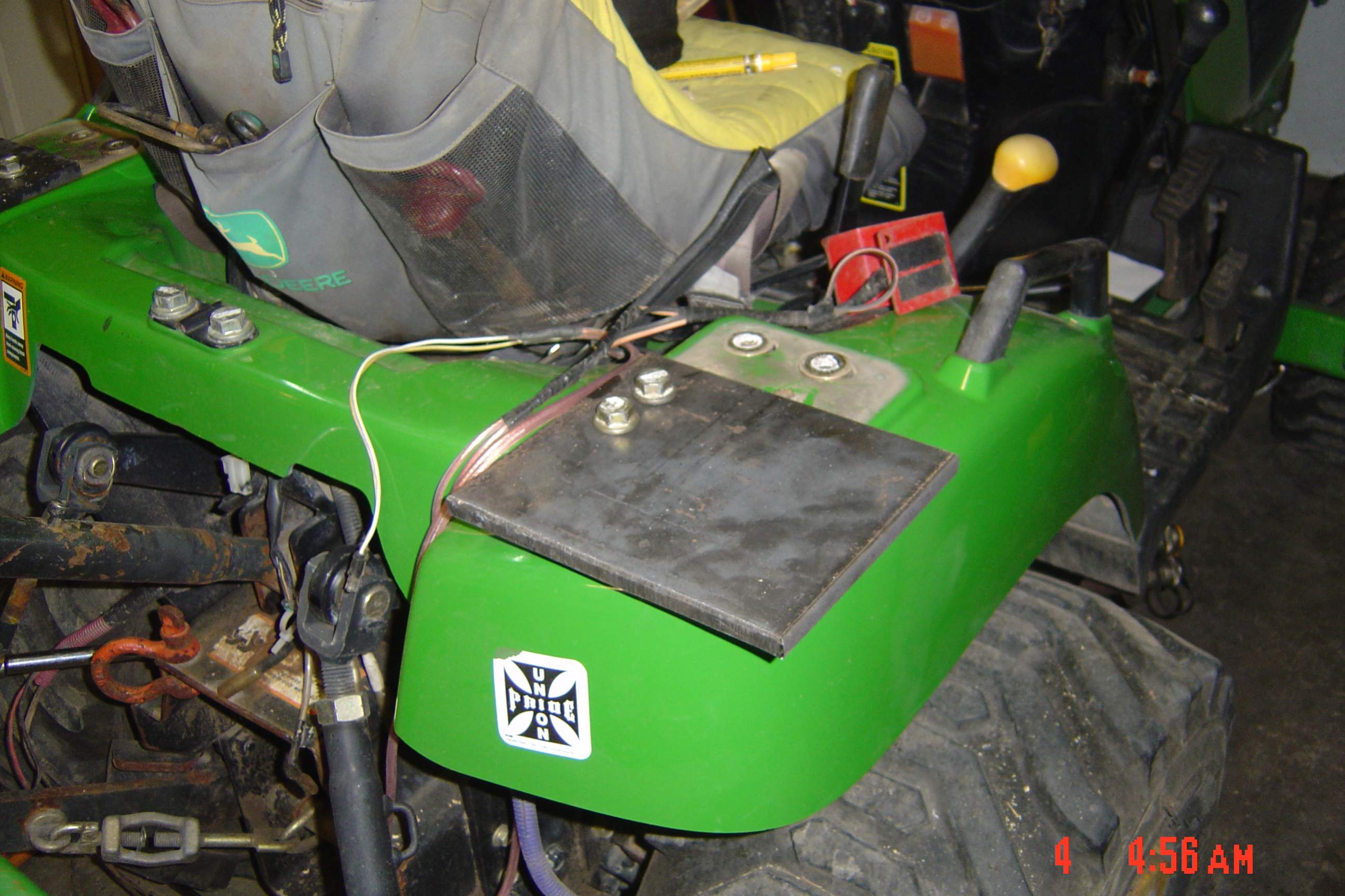 The build: I liked the way husker built the cab so it didn't contact any of the tractor parts save the front and rear posts where it is pinned...as well as gaining some much appreciated operator room. So like him, I removed the ROPS and used the mounting plates as my rear mounts then fab'd a couple arms welded to tractor frame and angled away from loader arms for the front. 3 bolts on each side and the whole cab lifts up n off. Def. a 2 person job (or a hoist and a rope thrown over the ol' oak tree limb!) but for me it was all about easy on-off!