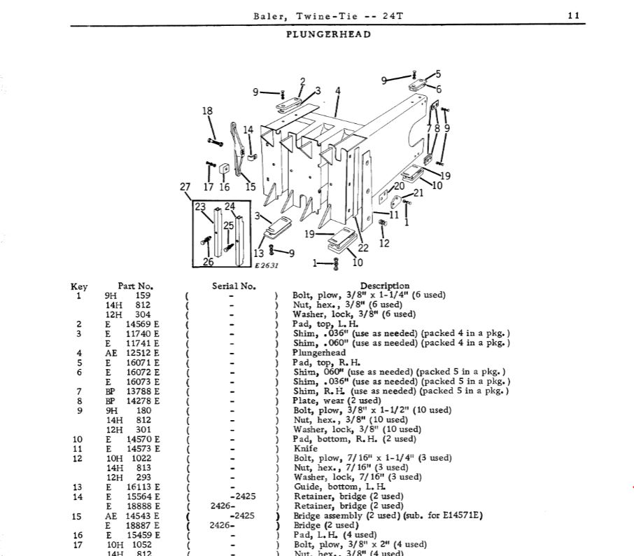 One thing I dislike about JD 24 series balers are the plunger head adjustment bridges with pads(parts keys 15 & 16) that are held on PH with one bolt that have a long history of breaking and the bridge can get lost in the field.