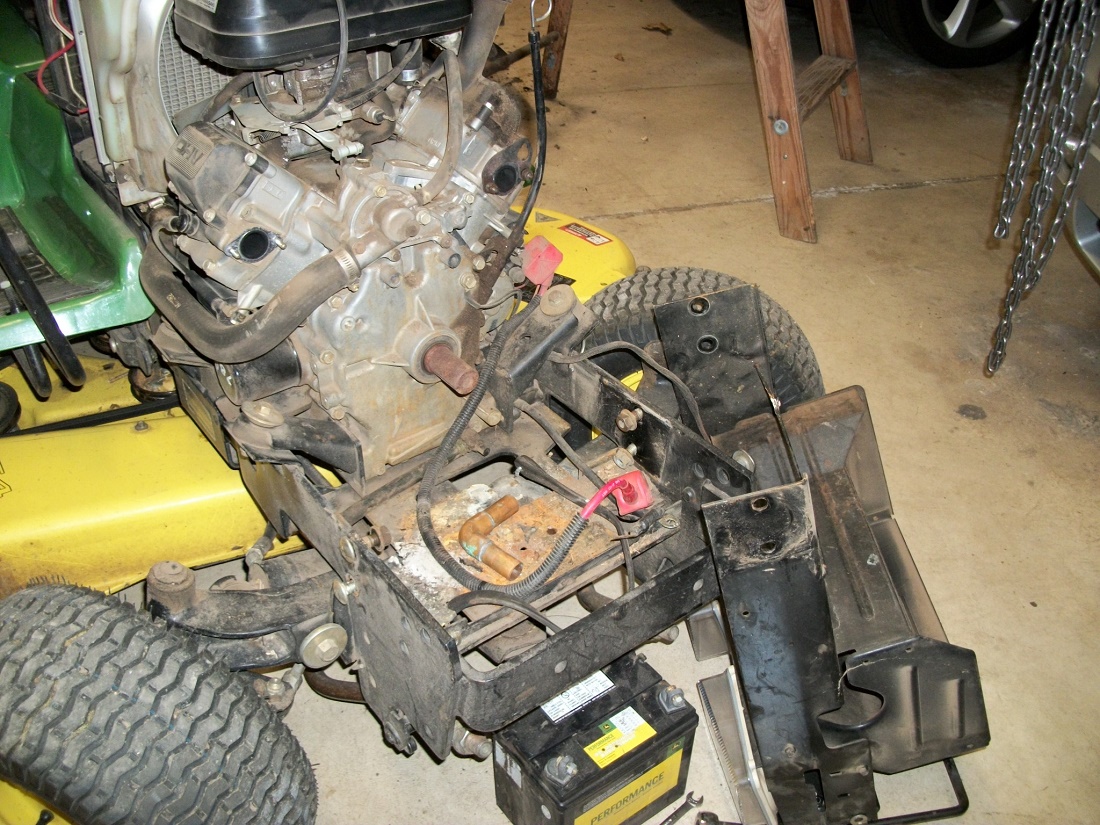 Have the engine sitting on my tool cabinet and found a plastic tray that just fits on top to allow cleaning the engine off before removal of parts. So far, the words of wisdom that the hardest part is removing the engine from the tractor holds true. :)