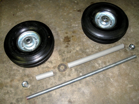 The photos below show the parts and how they are used. Harbor Freight had 8 inch wheels for $6 each with free shipping. The axles are 5/8 inch all thread rod (18 inches long). If I had my drill press operating, I would have used plain rod and cross drilled it for spring pins. The 5/8 rod fits standard wheels and is the right diameter for the 1/2" conduit I used for the spacers/sleeves. I used plastic conduit because I had some laying around and I think it will hold up. If I was starting from scratch, I probably would have used 1/2" metal rigid (not EMT) conduit. The rigid/plastic is about the right size to fit in the mower deck wheel housings.