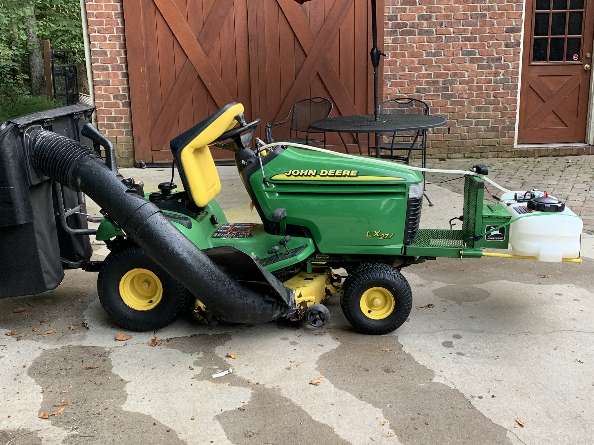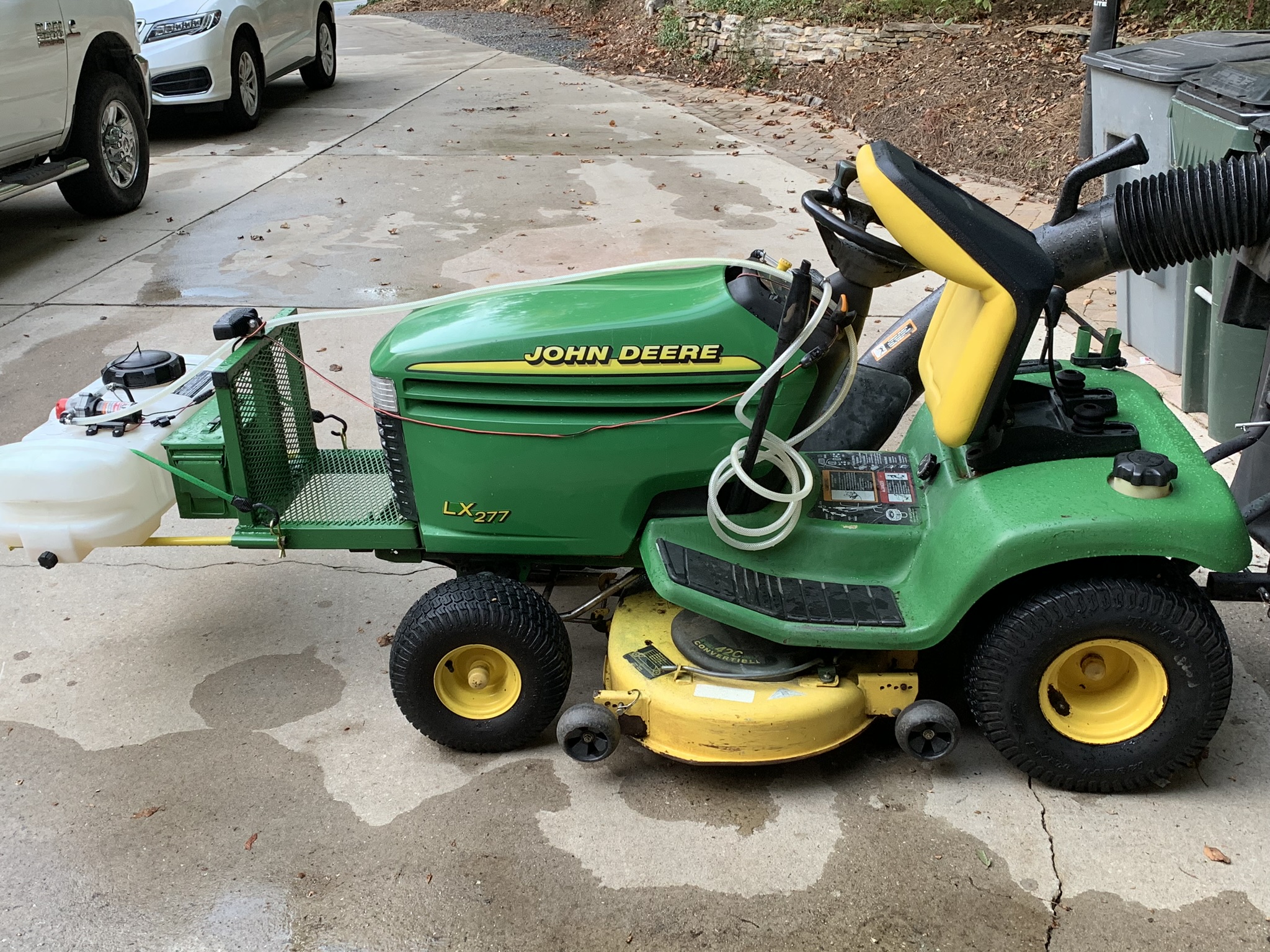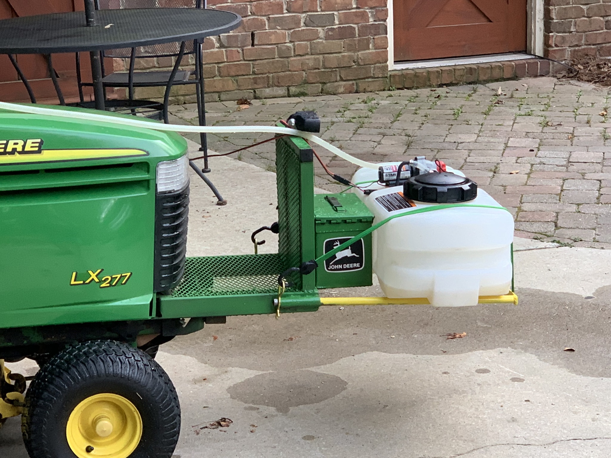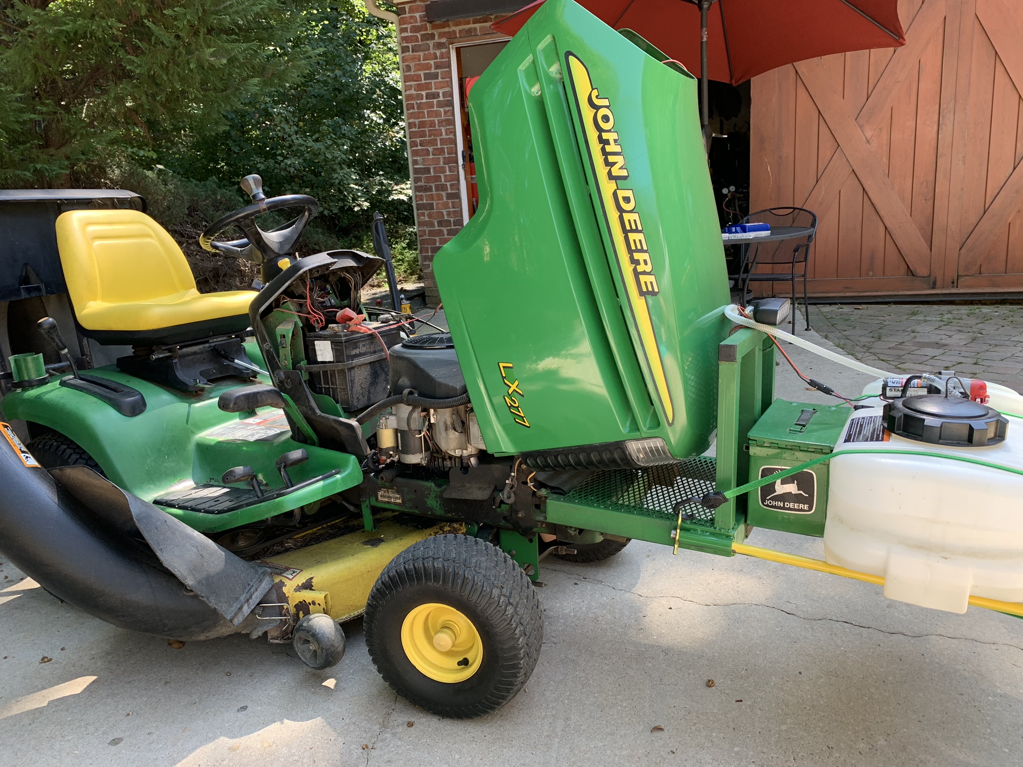 So most of you all know that the FRIGGIN' PLASTIC bumpers JD puts on lawn tractors is about as lame of a bumper as they get. After breaking several bumpers on my 20 year old Lx277, I finally went ahead and made a custom one that has worked out great. I made it such that the hood can be opened without removing it. This past weekend, I welded some additional steel on to it so I could put my 'portable' ATV sprayer on it. Check it out