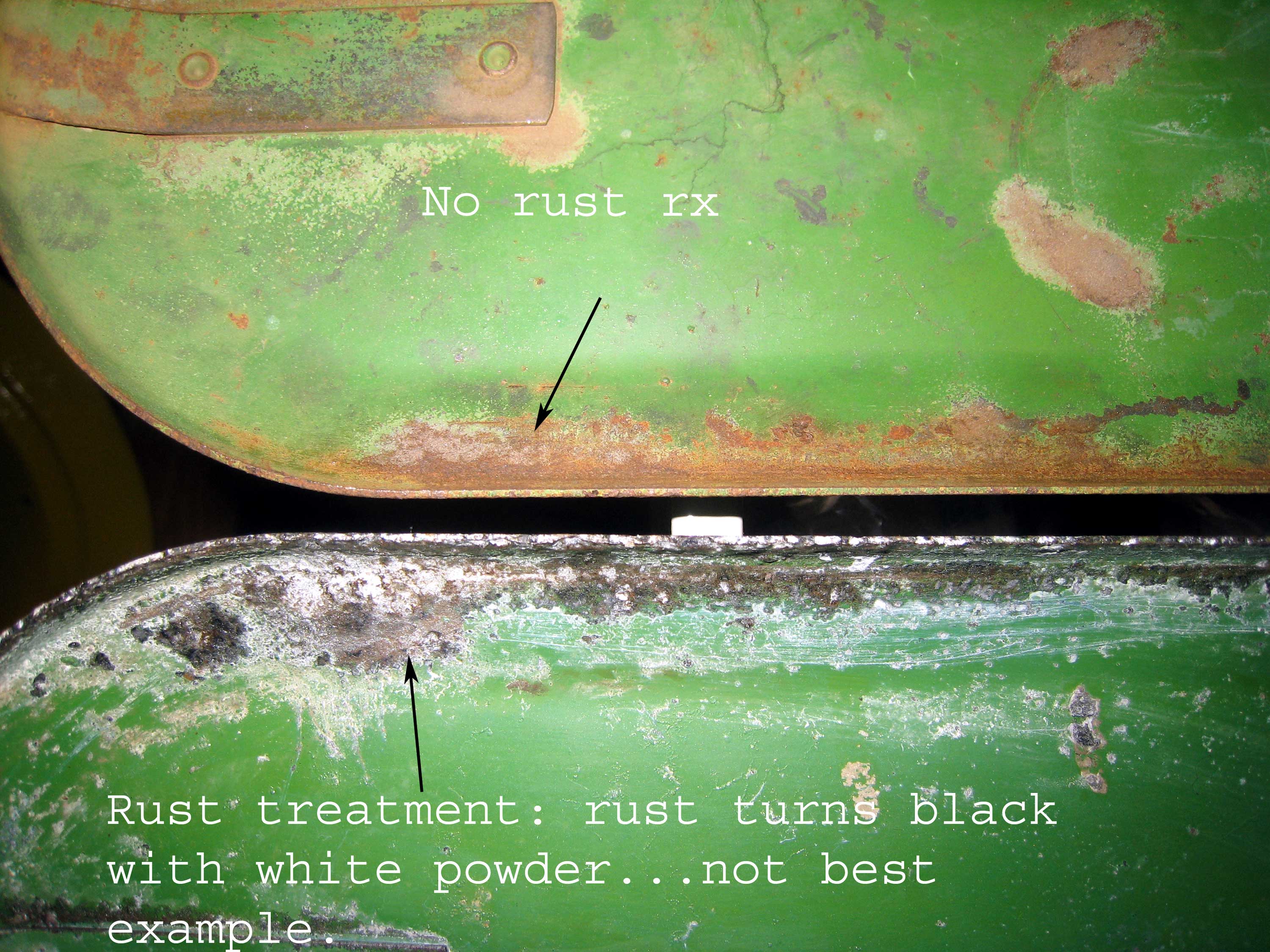 First after trying to find parts, I removed the planters and the side dresser from the frame. I wire brushed everything including bolts I could save. Next I tried a product from Lowes Jabsco Rust and Bare metal treatment. It is neat stuff. When applied to the metal where there was rust, it turns black. The next day it is dry and ready to put primer on. I found that if I applied over areas where paint remained that area would still be sticky so I just wiped it off with wate and let it air dry.