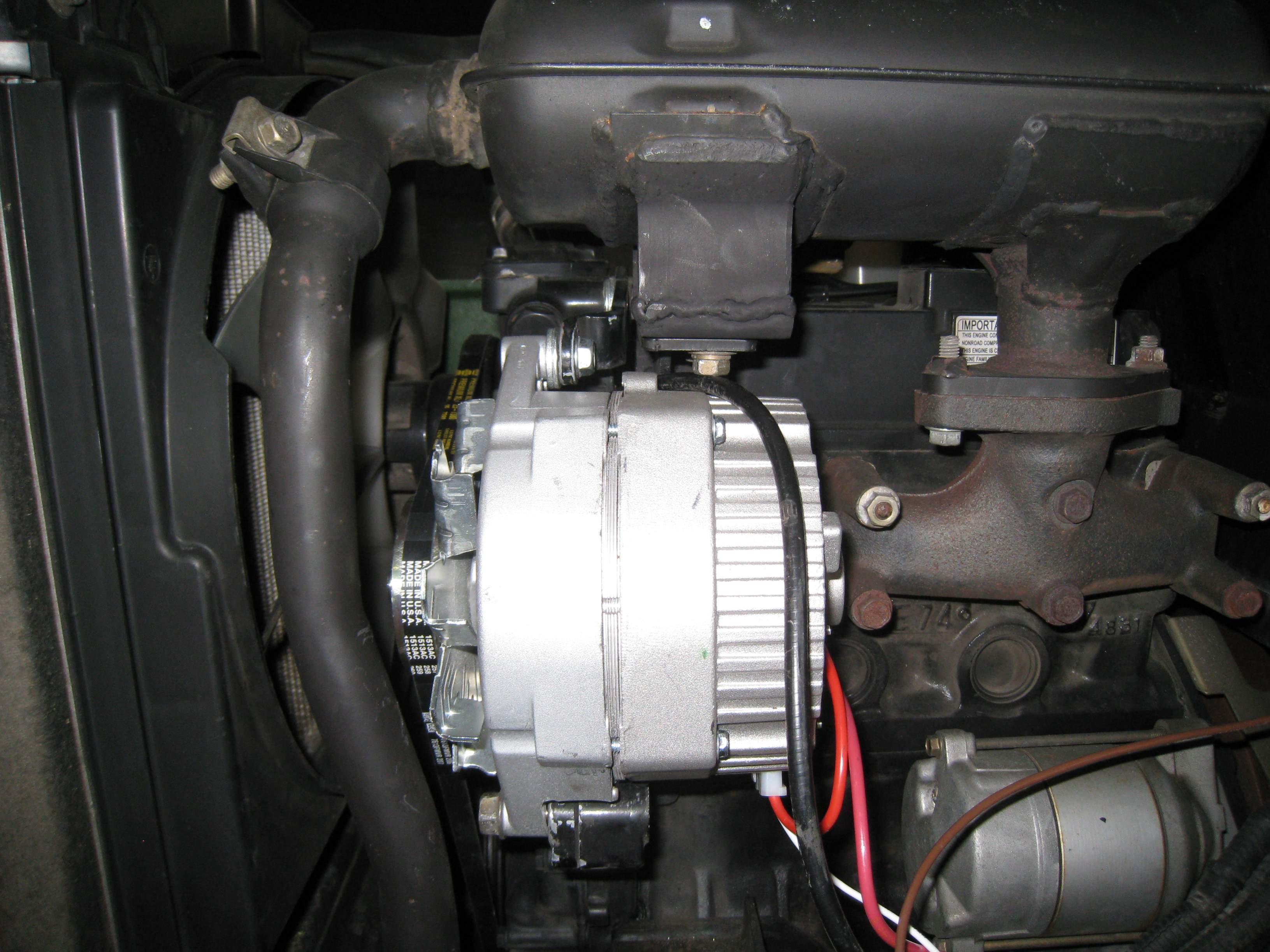 3) lose the original fan belt and replace it with a GATES 7385 or 7390 (the 7390 is easier to change if you have to but the 7385 lets the new alternator sit closer to the engine).