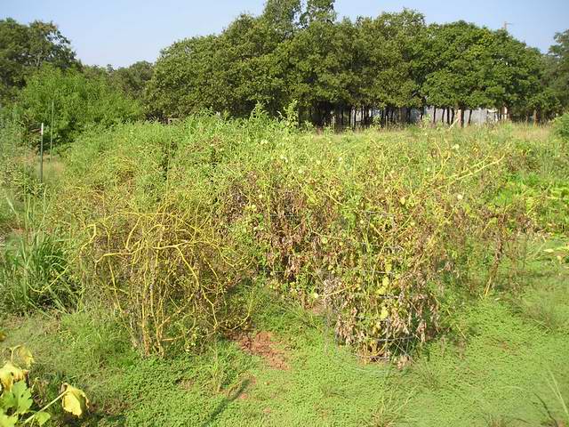 Bird, as Harvey can attest, it's not quite the jungle it appears to be. It is certainly grassy around the edges where the old plants have died off and the Johnson grass is clustered about. Yet, this morning we picked over 10 lb of tomatoes, several squash, and about 3 lb of okra. Tomorrow morning I expect to pick a half-bushel of peas. We aren't quite yet ready to mow it under. Next year I'm going back to wide-spaced rows. I can maintain those better.