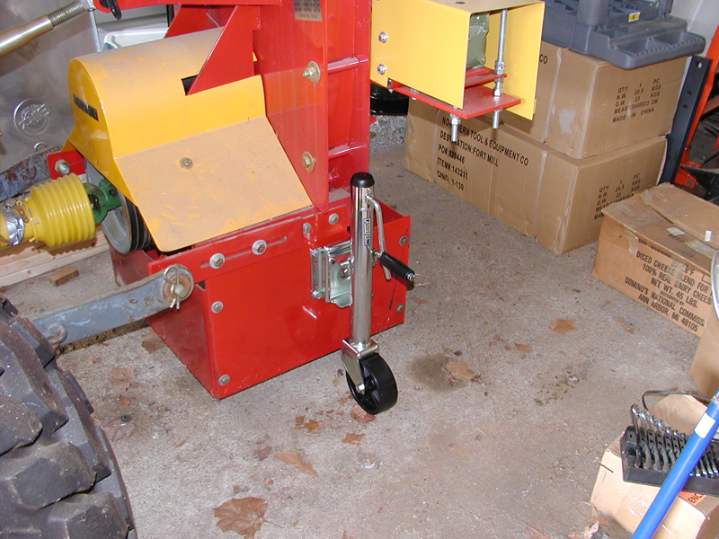 chipper I simply rotate the jacks to their horizontal position and lock them. They are then out of the way. This 20 minute modification was well worth the trouble. As best I can remember the jacks cost about $10 each from surplus. I have attached 3 photos taken right after installation. They show how the jacks were mounted to the right and left sides, how they look set vertically and how they look set horizontally for storage.