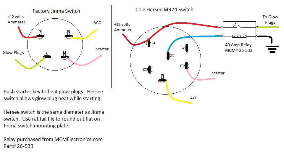 I replaced my Jinma switch with a Cole Hersee M924. It was a lot easier than I thought it would be. I looked at the Hersee specs and saw the switch is a lower current unit but allows glow plug heating while starting (unlike the Jinma factory unit) so I installed a 40 amp relay. The Hersee switch is far better quality than the Jinma and the Wesco Ford switch. I initially bought a Ford switch but realized it wasn't much of an improvement over the original.