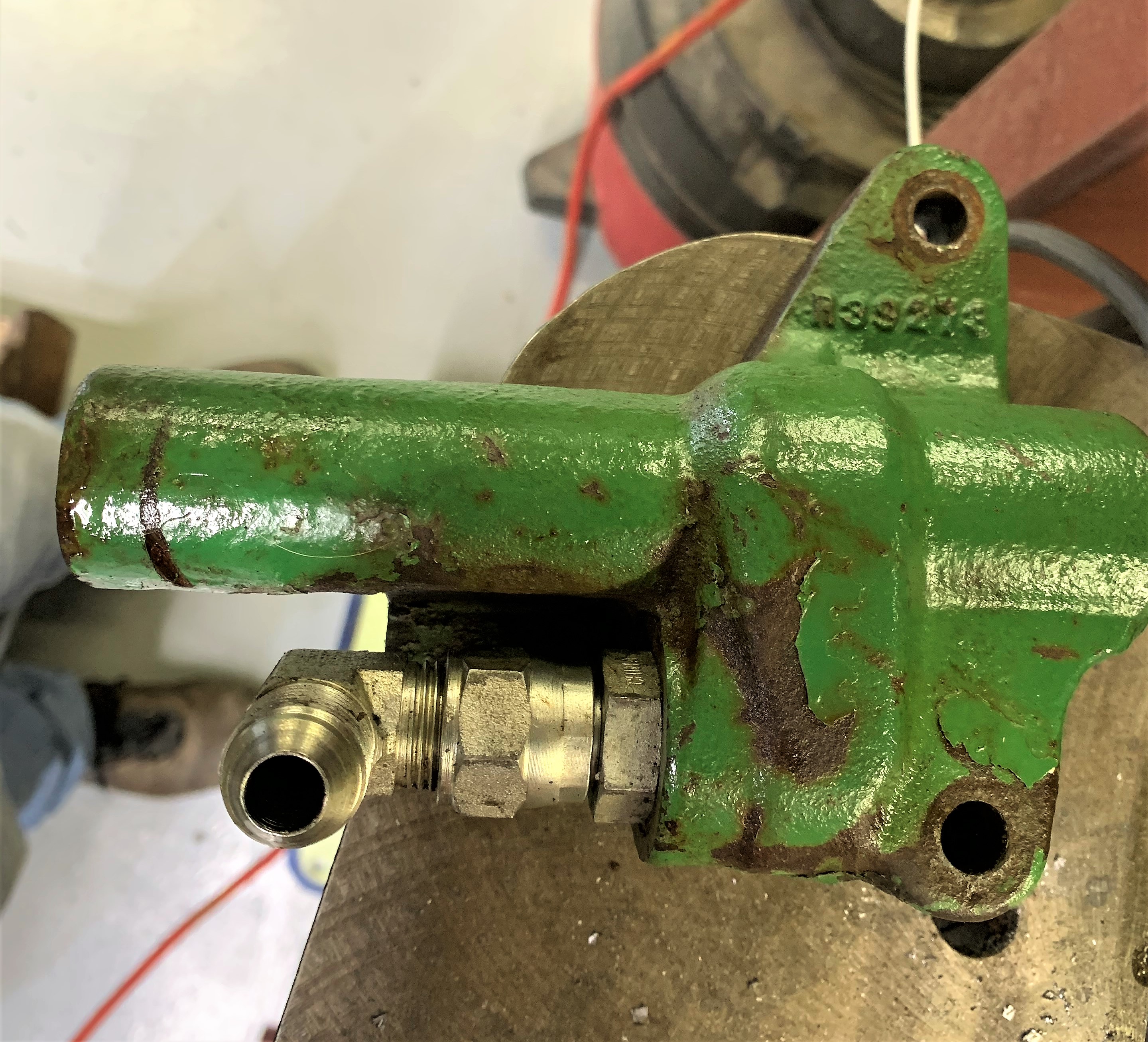 Looking through the Hydraulic fill hole with 3-point raised I didn稚 see any fluid splashing around, rockshaft piston well sealed. I read one blog where a fellow said he had lots of debris in the Hydraulic PCV (Pressure Control Valve) R39273. I decided to look in mine. The line coming into the PCV looks like it was a brazed repair after sanding the paint. Once I got the PCV off and removed the inlet fitting I couldn稚 get the piston out. As you can see in the picture I looked like it had a clip holding it, strange. I discovered a piece of metal ス long シ wide (a ***** to get out) was holding the piston retracted. Once out I also noticed 3 extra shims/washers.
