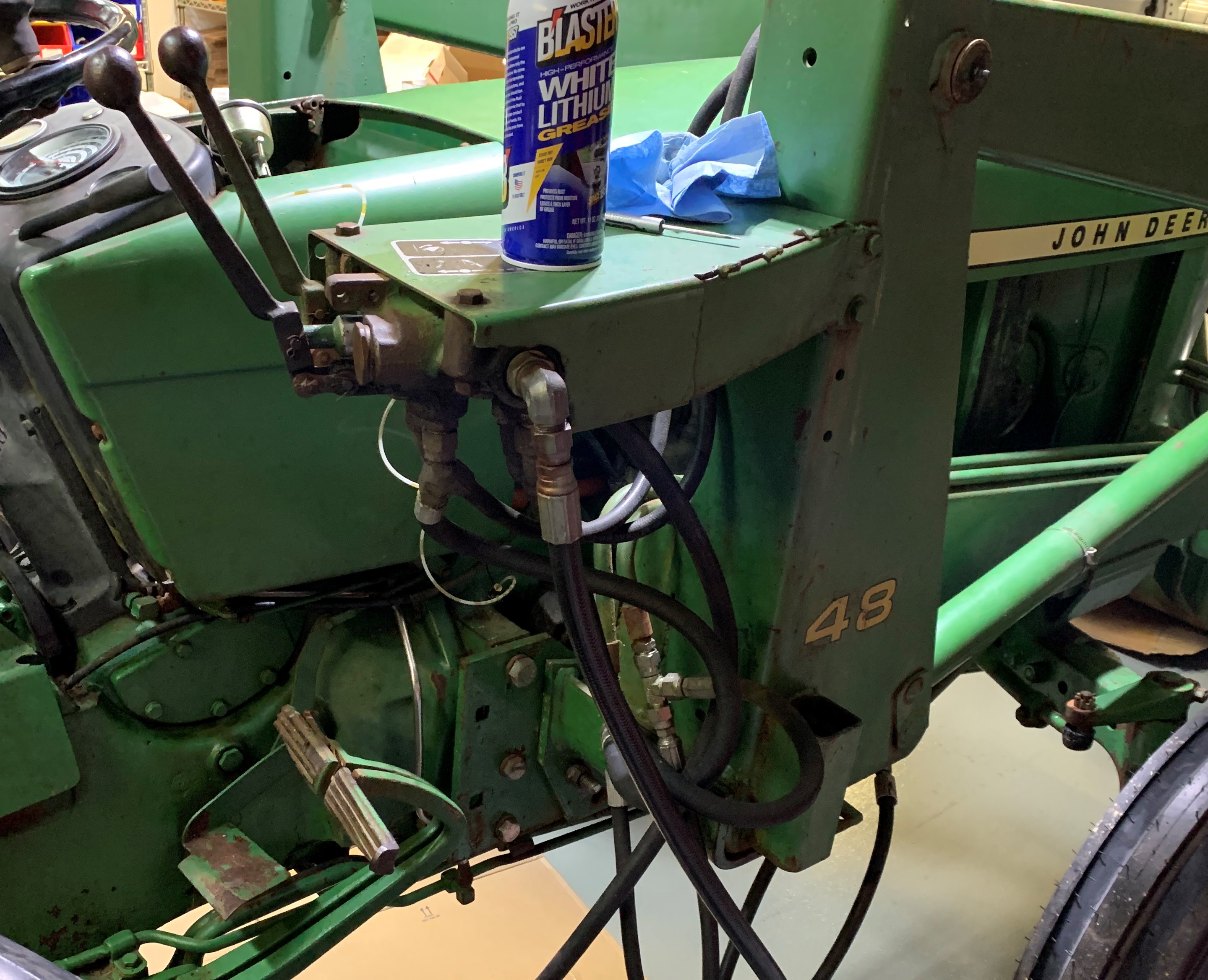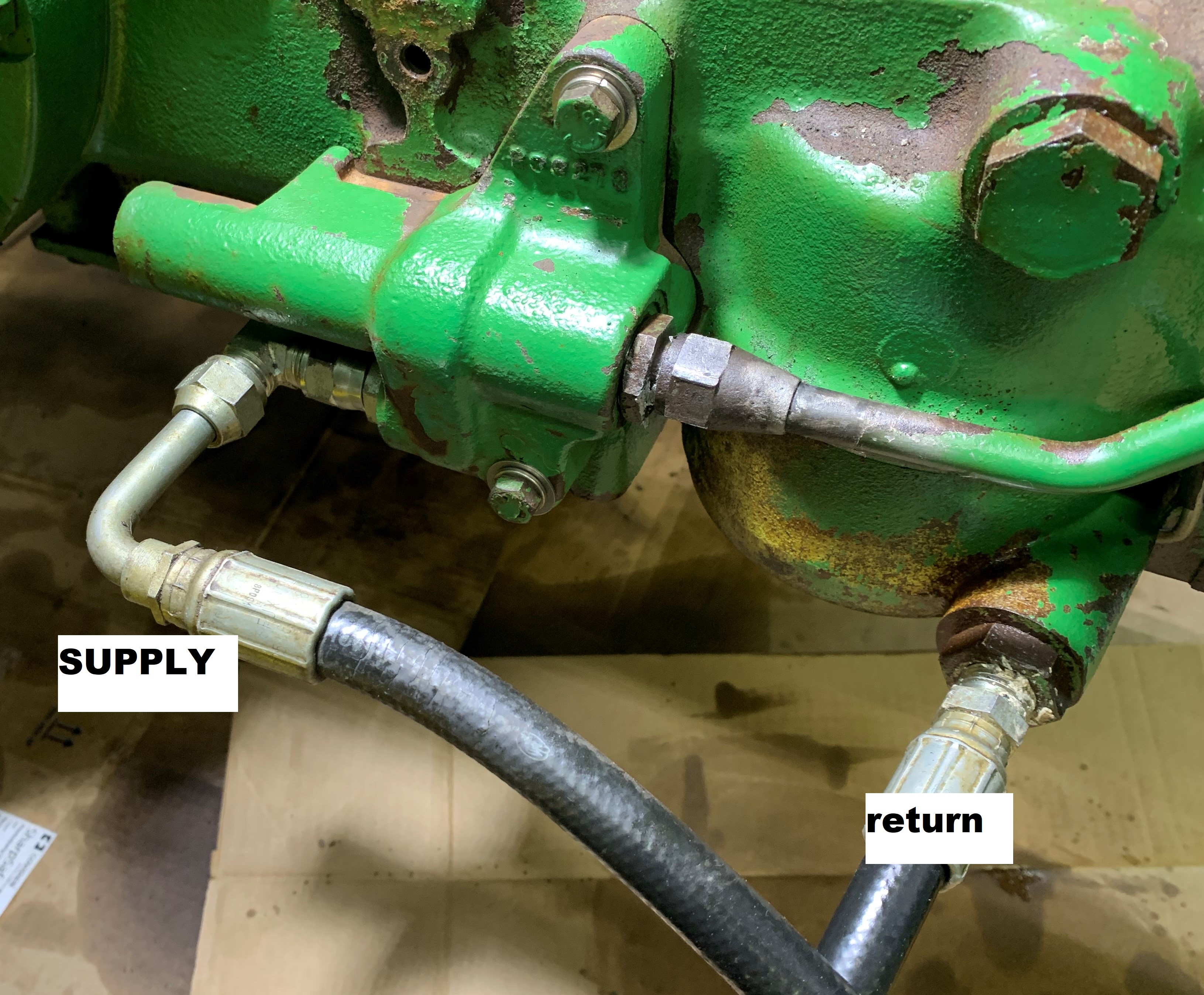 I started doing a little loader work and the front pump started caveating then I lost all power steering and FEL stopped working. The 3-point was holding 1200# rear weight ballast fine and could raise and lower it fine. I idled for a bit, got off looking for a broken line and then power steering and FEL worked, jerky and weak, but enough to get back inside the shop.
