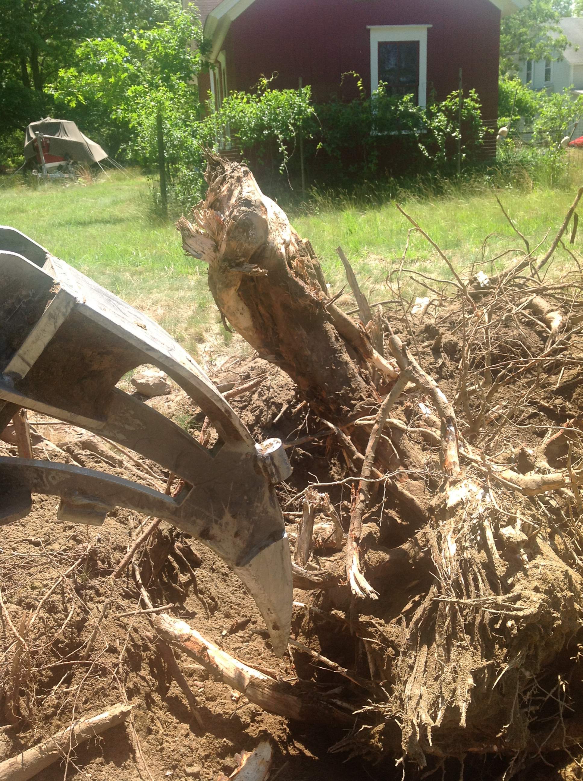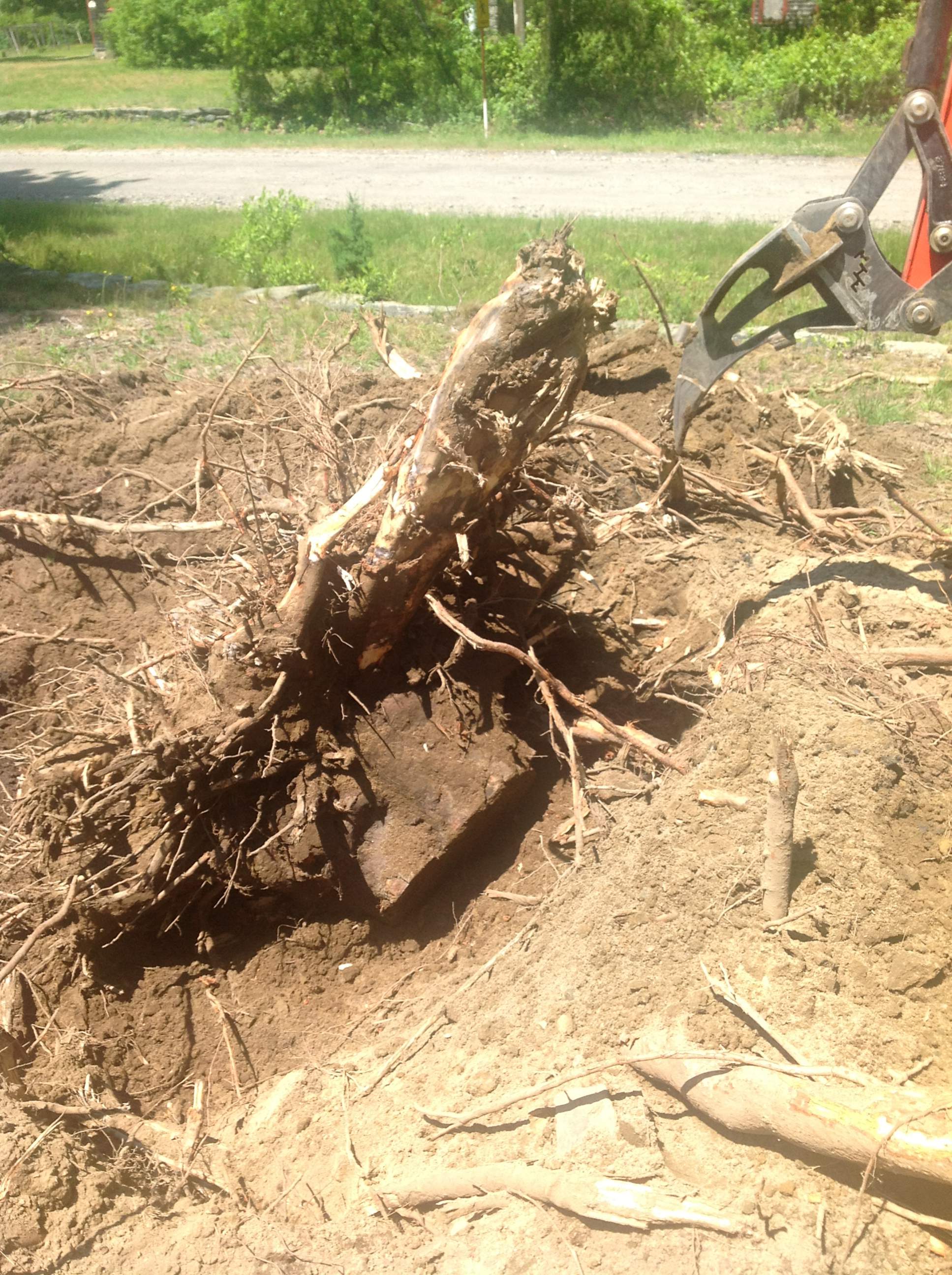 I don't have any serrated edge on my ripper but I do have two welded pieces of drill pipe that act as "meat hooks" and tear out a chunk of root whenever they pass over it with pressure. The hook on the backside of the blade is most useful for tearing up thick lateral roots that I cannot break directly with the ripper blade. I isolate the root and then put the back side of the ripper against it then move the dipper forwards and backwards with down pressure. The hook takes out about half an inch to an inch of the root each pass until it is sufficiently weakened that I can then just rip through it using the standard ripping technique. Worked well today on a big Maple stump. Photos show the stump upside down still in the hole (I was digging the dirt out of the ball) and shows the bit lateral root sticking straight up. Too big to simply break with the ripper so the hooks made the difference.