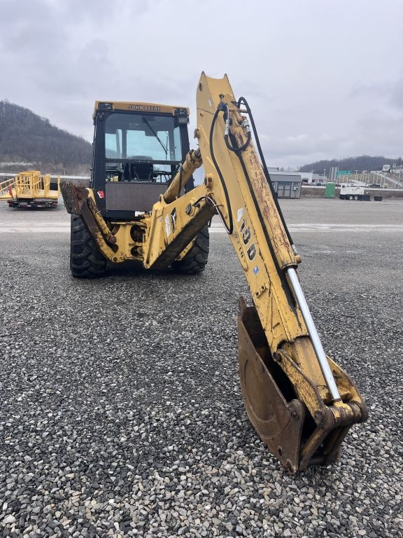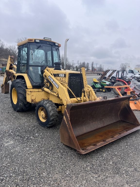 John Deere 410D Backhoe, Cab, 4x4, Loader, 6,539hrs, Extendable Boom, 12" Digging Bucket, Out Riggers, NEEDS BEARING IN REAR WHEEL, Municipal owned and Maintained, SN# T0410DG807133