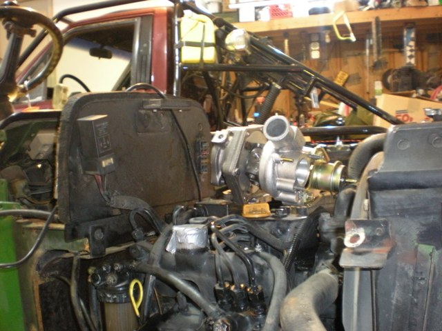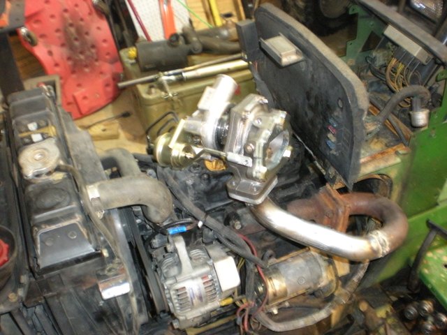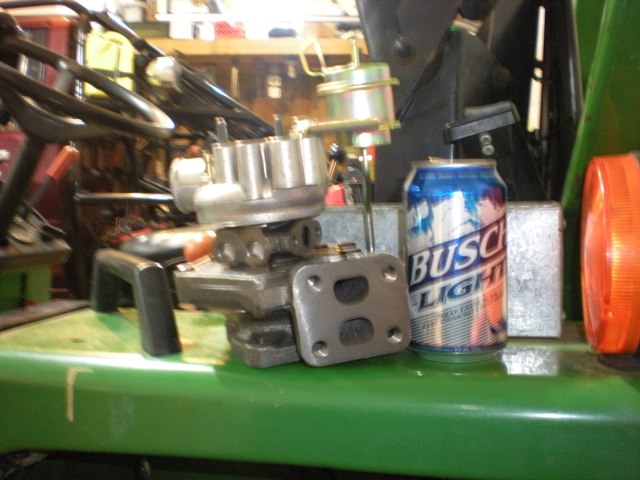 I started my turbo install on the JD yesterday. I am in the process of making a header for it, because the turbo was too big to fit where the muffler was. The turbo will sit above the engine and drain the oil back to the valve cover.
