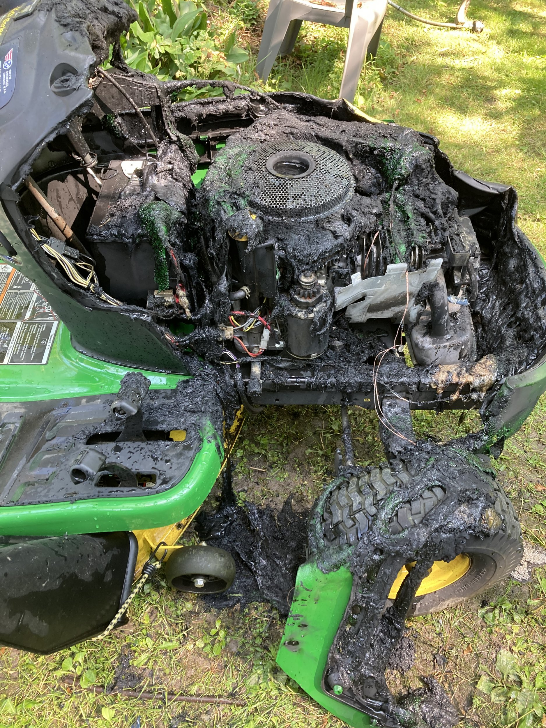Our John Deere E110 mower caught fire last Saturday. Still don’t know the reason why. It started in the front near the exhaust. But it didn’t have any electrical issues or gas leaks. It was the first time we mowed my daughters backyard. It wasn’t that big a yard 60x45 feet. The grass wasn’t that long. It only took about 1/2 hour to complete the lawn. Put the mower in the shed, shed doors open to let it cool off. Then 10 minutes later smoke coming out of the shed. I ran to find 7 inches of flame coming out of both sides of the front hood. I pulled it out of the shed. Was too far from the water hose. Couldn’t find the fire extinguisher. So buckets of water finally put it out.