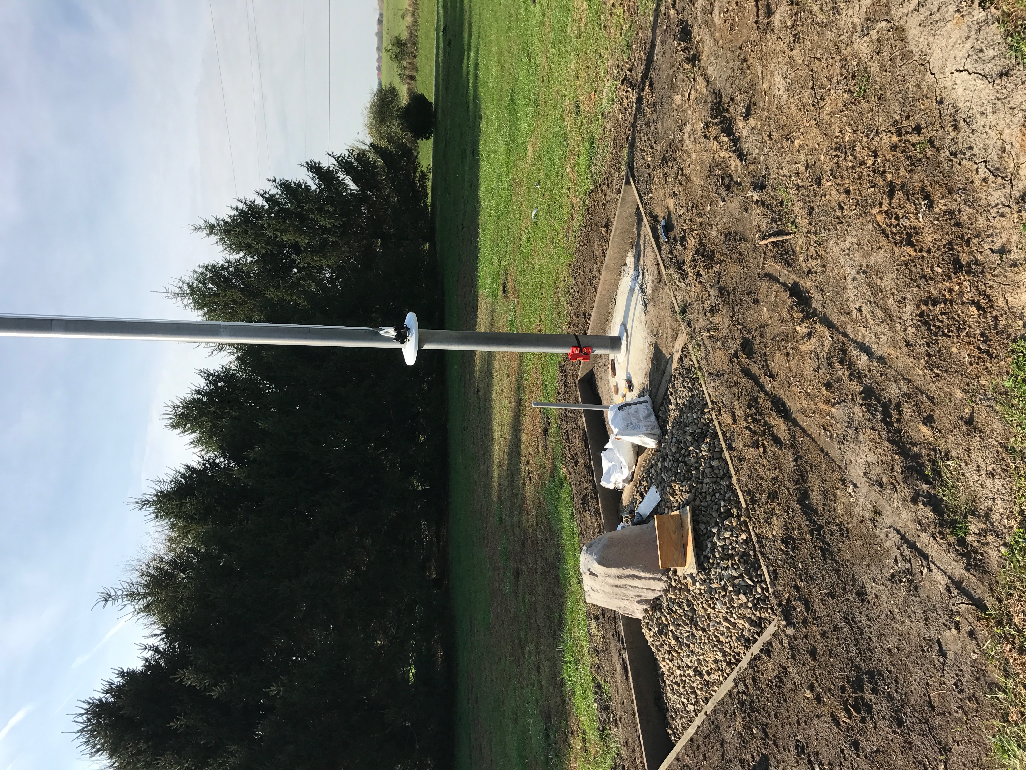 Through this thread one thing is missing. OP states the ground rod is also buried with a wire coming up out of the concrete. Inaccessible ground connections are required to be a welded connection. Electricians use a thermite welding process to bond dissimilar metals (the ground rod is copper clad steel not solid copper). DIy process is to Bronze weld it with a torch. Bolted connections will corrode and lose their conductivity fast in normal soils and faster in acidic soils. You definitely want to bond the pole to the ground especially if it is powered. There may be an interface device to install between the pole ground and the electrical service ground to prevent a lightning strike jumping into your house panel. Also bond to any outside source of power (there are several code issues here that vary by jurisdiction regarding grounding and bonding. If you are not using an electrician recommend you get a copy of "Soares Book on Grounding and Bonding". It is based on the NEC only. Worth its weight in gold to eliminate the bad dope surrounding this issue, even electricians refer to it all the time.
