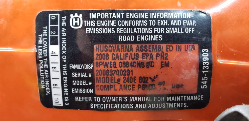 He told me that he had a broken/junk Husqvarna E-Series 240 x-torq chainsaw that I could have to try to repair if I wanted. The sticker on it says 2008 emissions compliant, so it's at the worst... 10 years old and doesn't appear to have fade, wear, cracking or any indication of heavy use.
