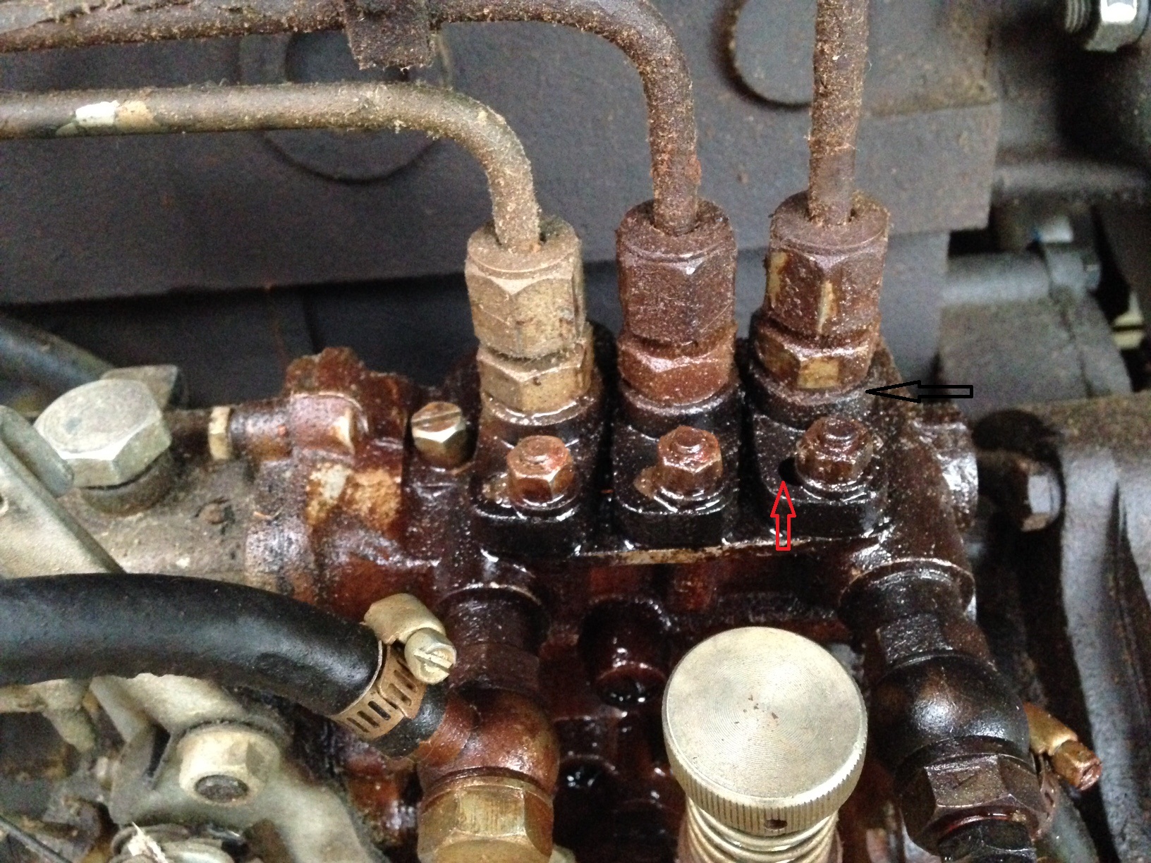 I have a KAMA 454, 45 hp with a 3 cylinder diesel. I have noticed where the lines come out of the top of the injector pump, they are leaking. It's not the nut where the line tightens but under the hex just below. see photo. With tractor off, you can see the leak by using the priming pump. When running it just drips. What is the sealing method that has failed?