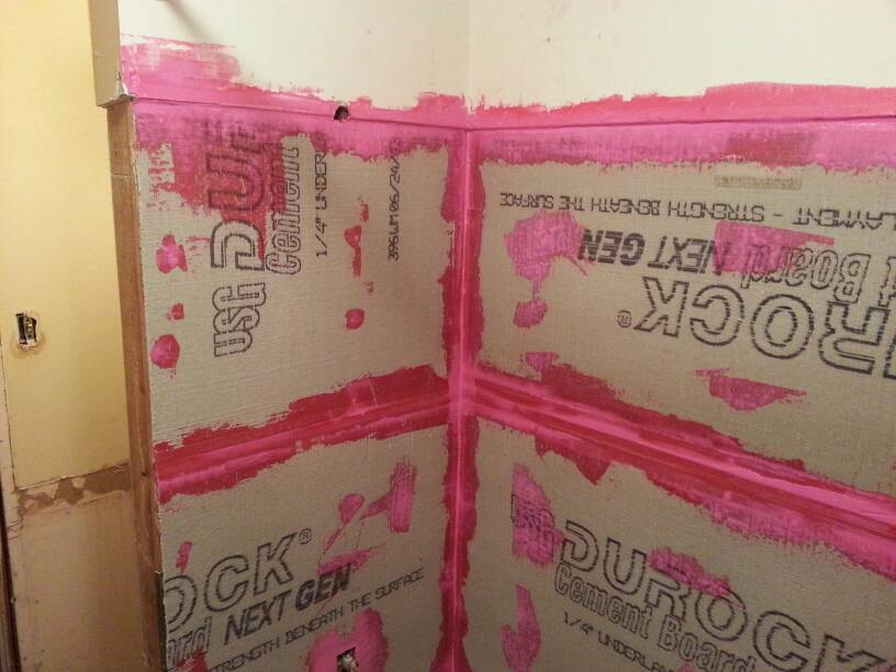 As for Kerdi, its a great product but you have to use unmodified thinset mixed loose that you trowel on the wall surface. Then you apply the kerdi membrane and use a trowel to press it into the thinset while trying to remove all air bubbles from under the membrane. You also use unmodified thinset to adhere the tile to the kerdi.