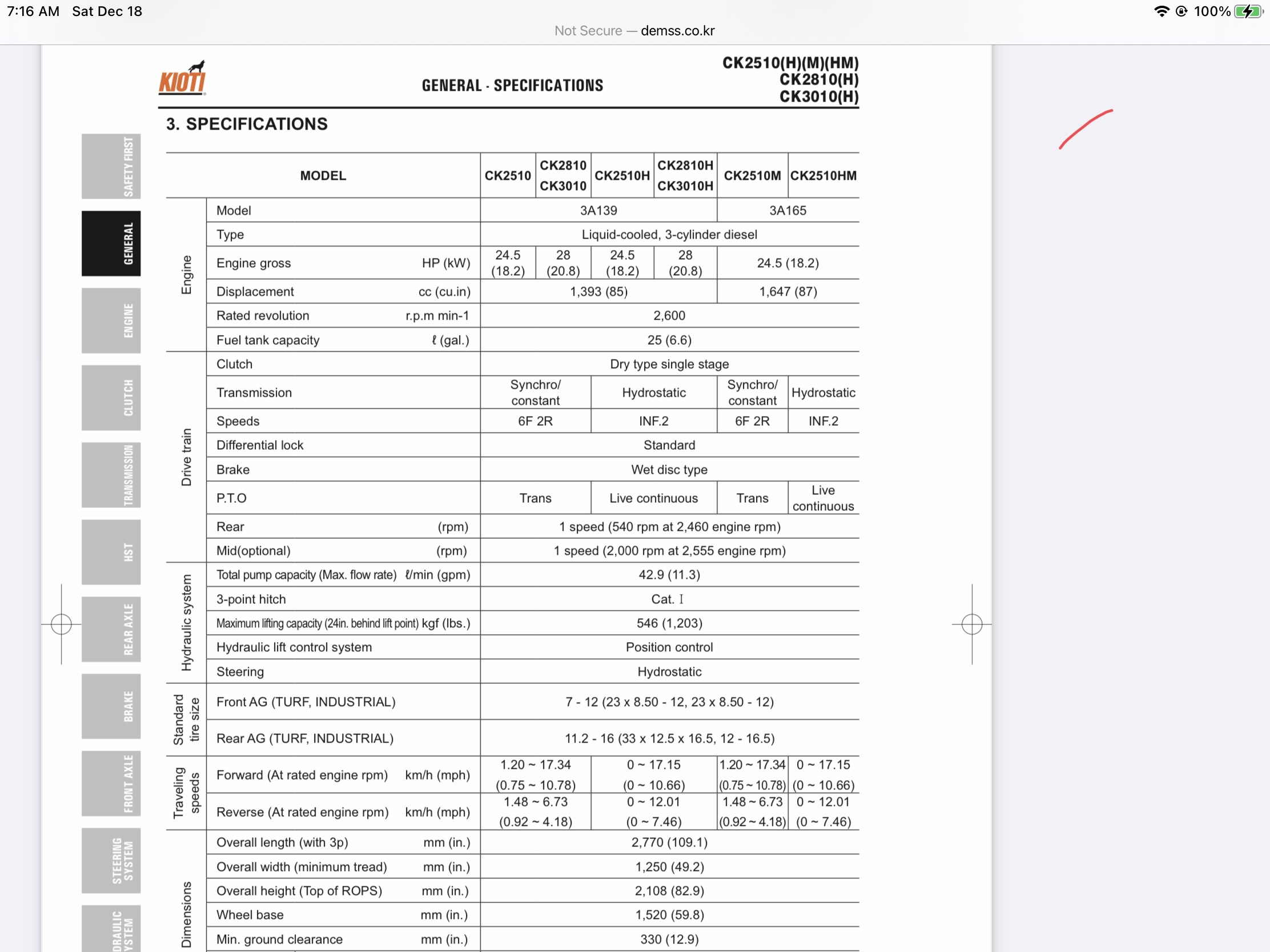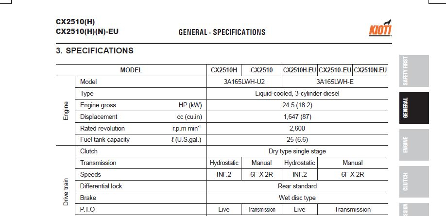 If it is 87 CI, then it is 1426 cc. Given there is a different engine number AND a different cubic inch number, I suspect they made a mistake on the stated cc...occam's razor...one mistake being more likely than two mistakes...and being it is a smaller/lighter machine.Not so. The CX2510 has the same 1647cc engine the CK2610 has (3A165).