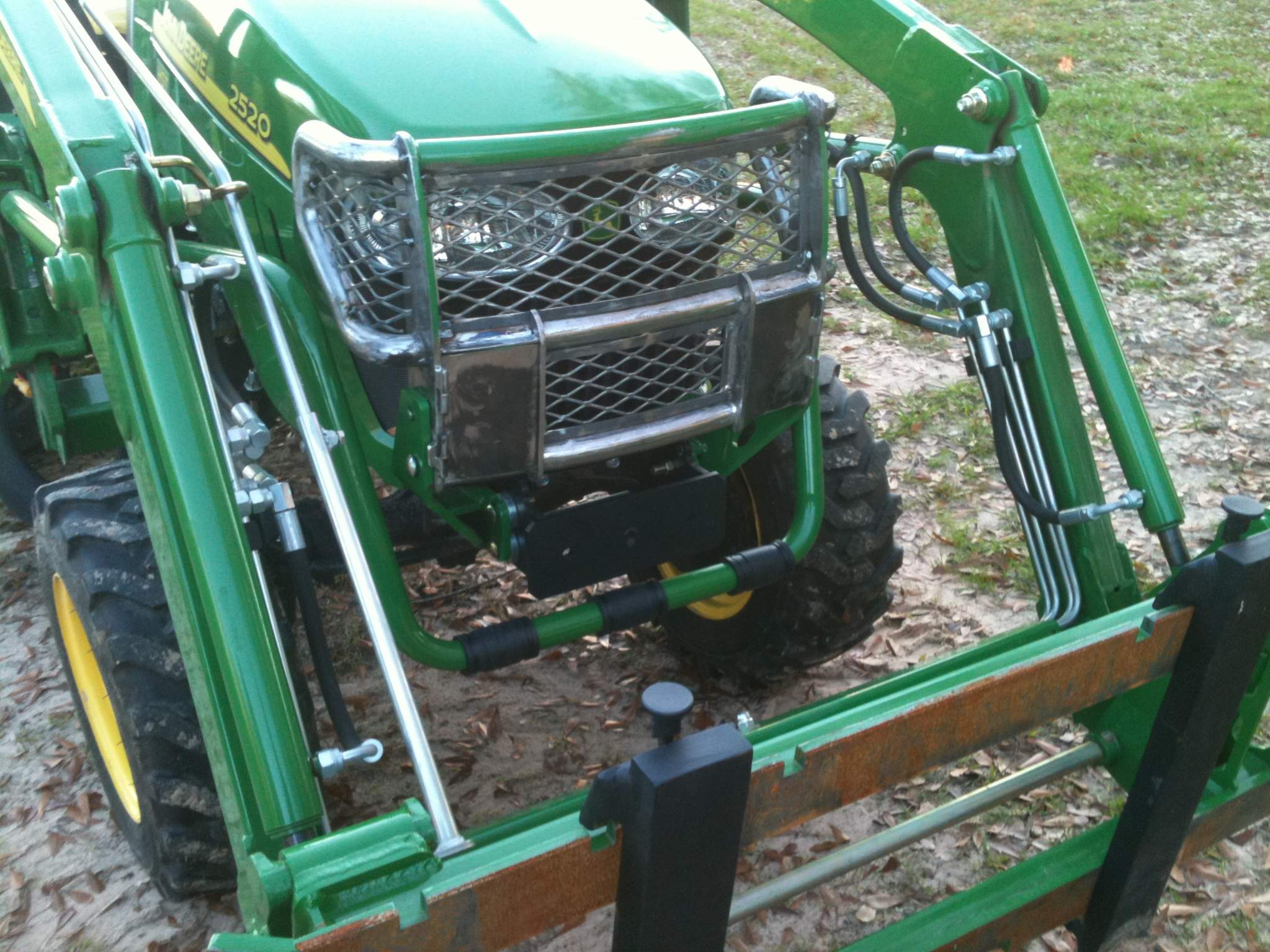 BTW...The 2520 grill comes with only 2 cross bars. I added the bottom bar and bent it to match the upper 2 bar radius's. The 2 doors are for access to the locking mechanism on the left and the right one will be for a 12v plug in for a winch. Its still a work in progress. I also added the side wings to mimic the larger deeres