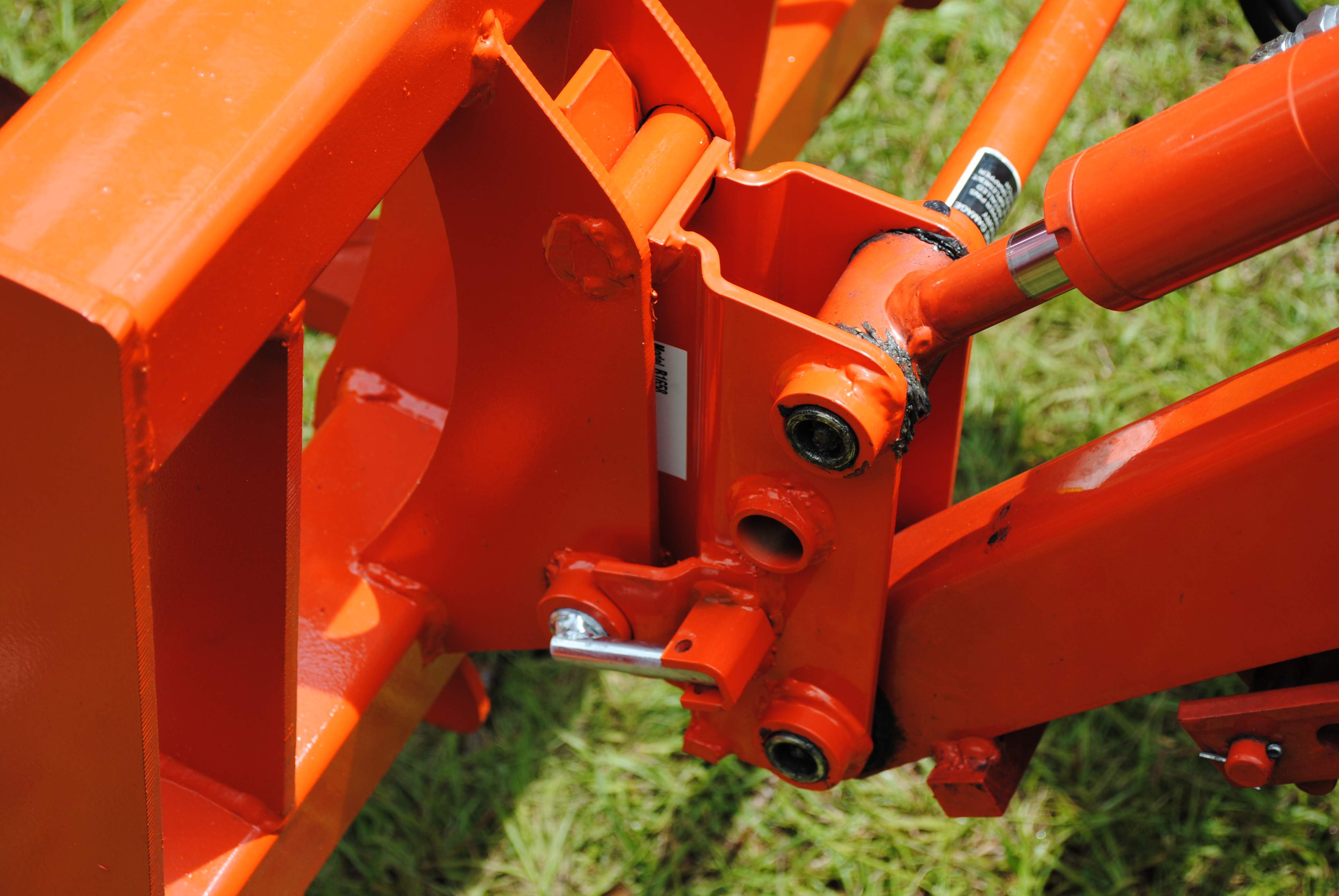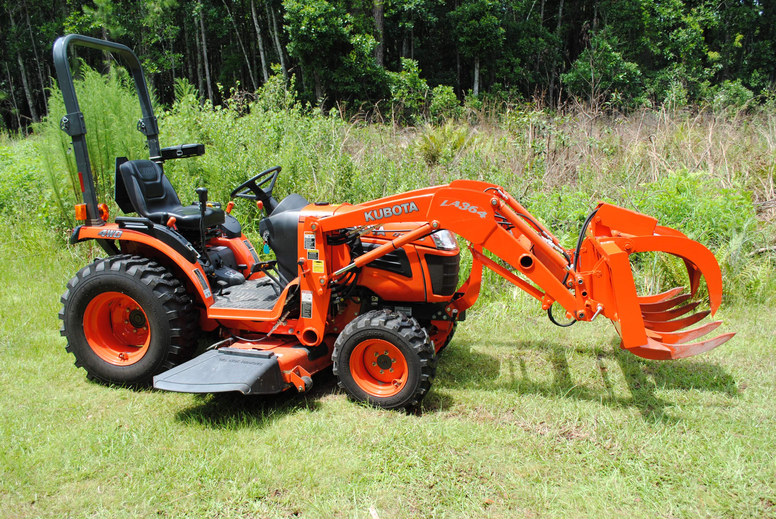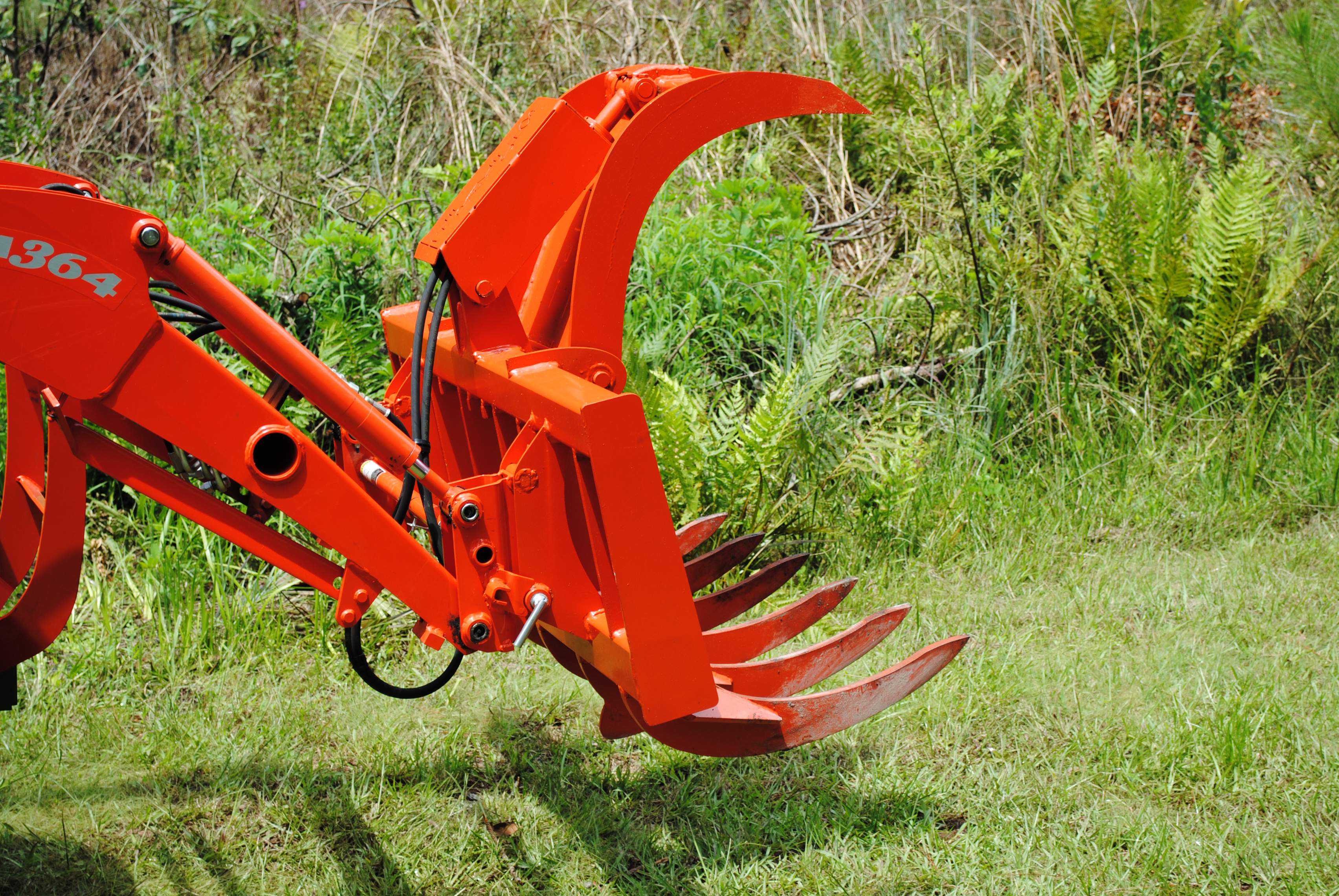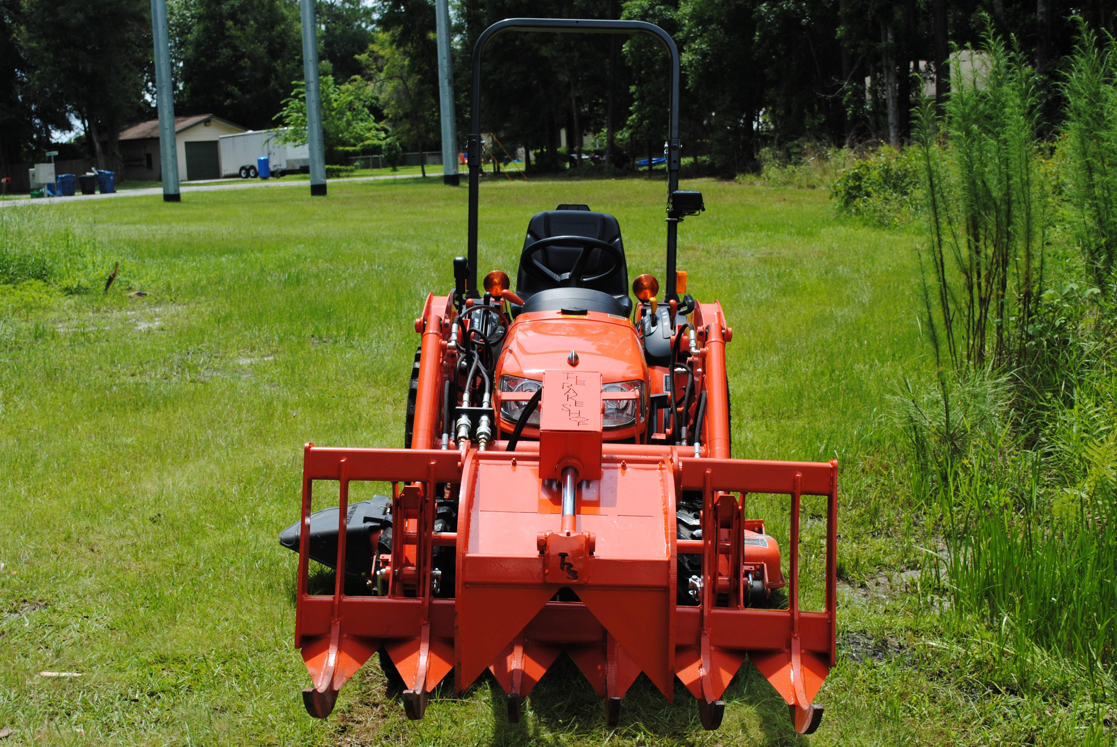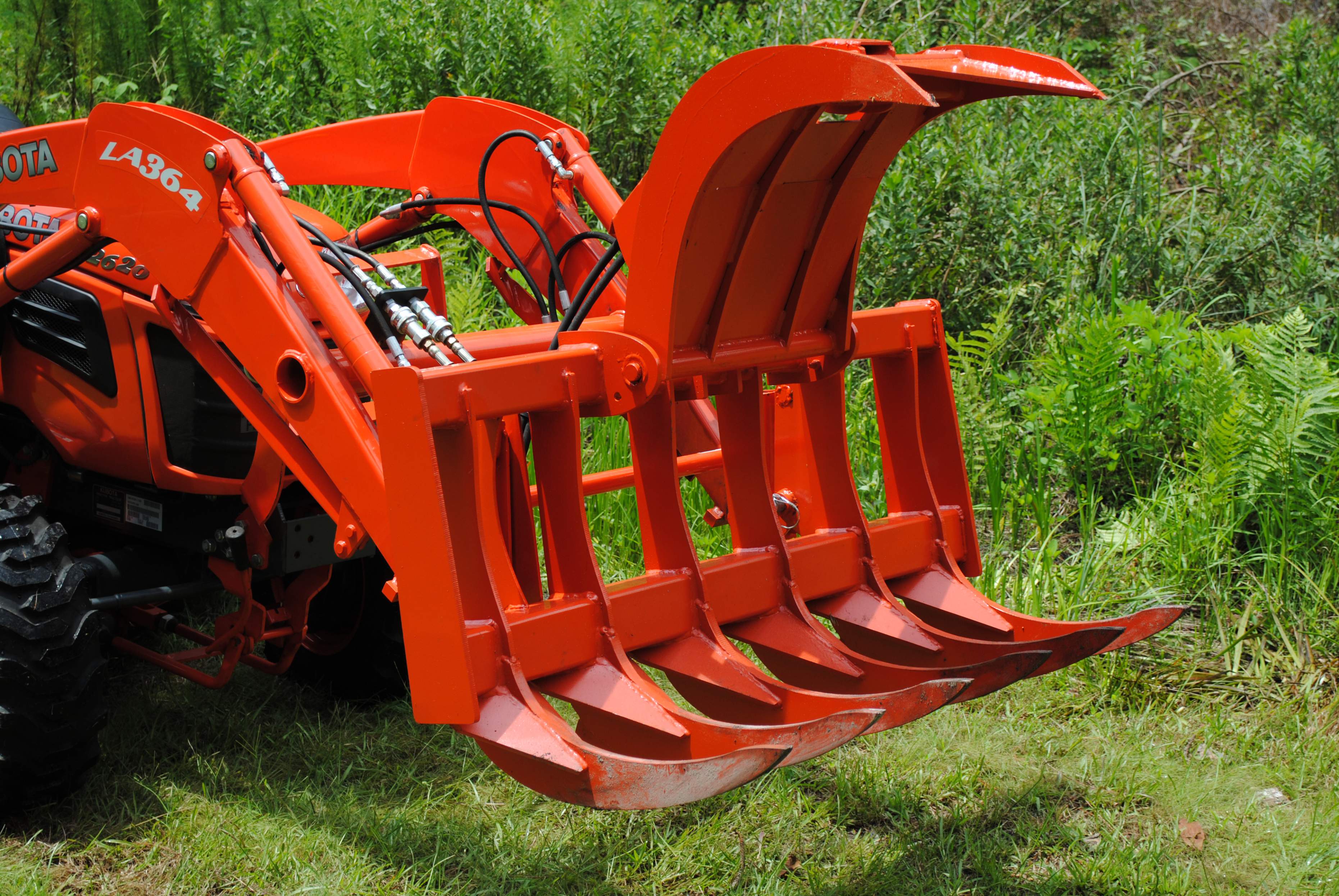I thought I would share some info on my recent grapple upgrade. First off, I have a Kubota B2620 w/ LA364 loader, BH65 backhoe and 54" mid mount that was bought new in April 2013. During the 50 hour service, I had a W.R. Long electic over hydraulic third function valve kit installed along with a B1658 quick disconnect for the loader bucket. I recently contacted Sam at the Rake Shop who built a 48" root grapple. I have had the grapple about a week now and this thing is a beast. The tines are made of 3/4" T1 steel which is double the strength of the competitors. The weight of the grapple is just over 300lbs but like how most of this weight is on the back of the grapple, minimizing the displacement of my lift capacity. Attached are some pics of the finished product. The rake grapple was even painted Kubota orange!