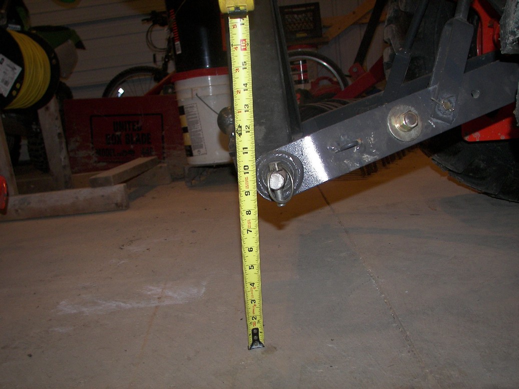 From looking at the pictures, it looks like you could move the connecting links to the other set of holes closer to the tractor (see pic) and I would guess that would lower the arms enough to solve your problem. However, I believe the connecting links are in the standard position, which usually works for most implements. I have used a lot of attachments and never had to move the connecting links on the 3pt arms. Have you checked the stop limit on the lift arm? Has the mower been modified? Was it originally made for a 3pt attachment?