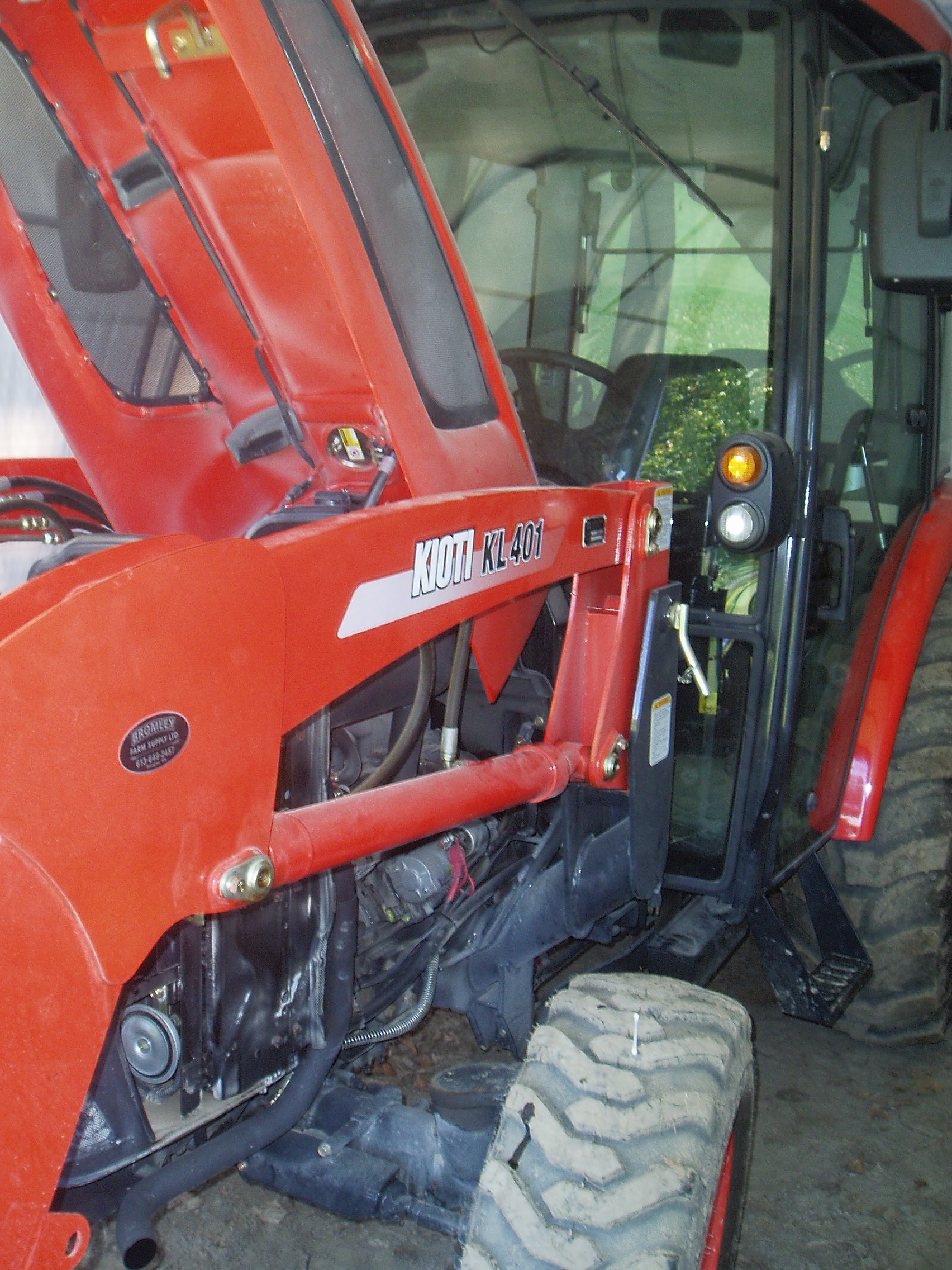 I have a Kioti DK45 cab. They've made it pretty easy, the last portion of the tail pipe is simply fit in place and secured by a bolt in a mounting bracket further forward. That is also in the perfect place to redirect the exhaust. My concern is the amount of heat on the hoses and cables that run in the same area. How close can they be if I wrapped them in tape as you seem to have done?