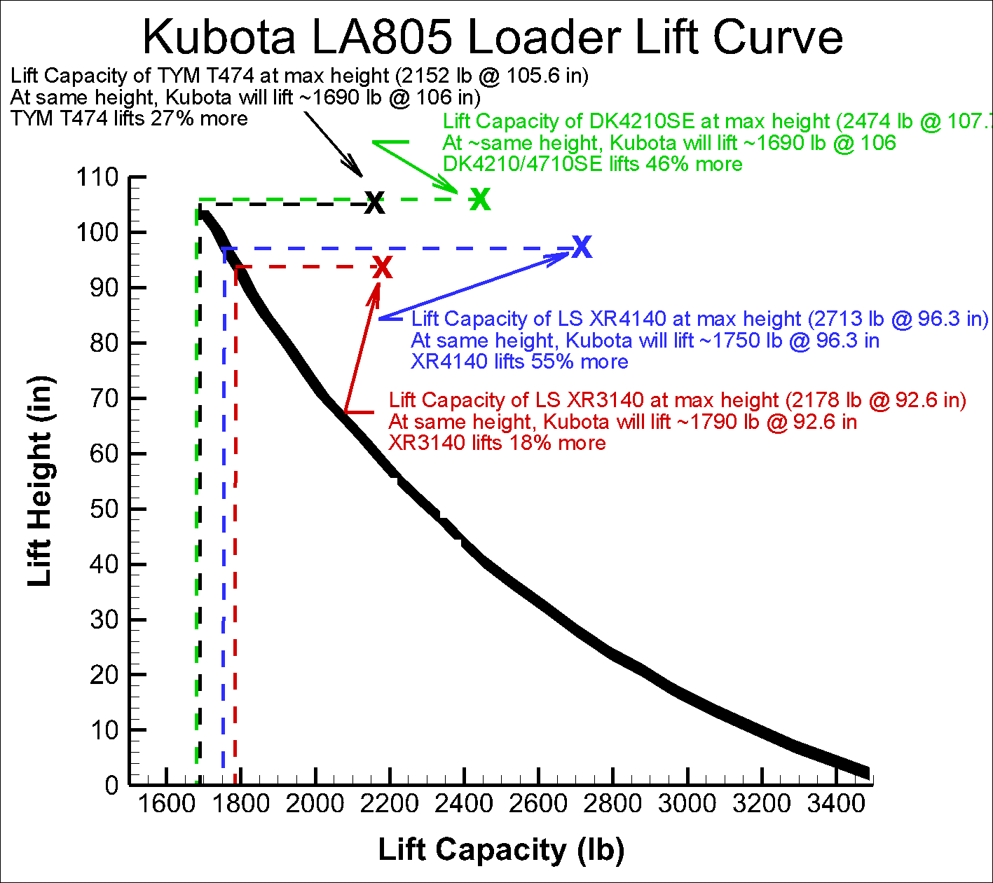 The plot below shows loader lift comparisons at the loader pin between a Kubota LA805 loader (spec'd out on a