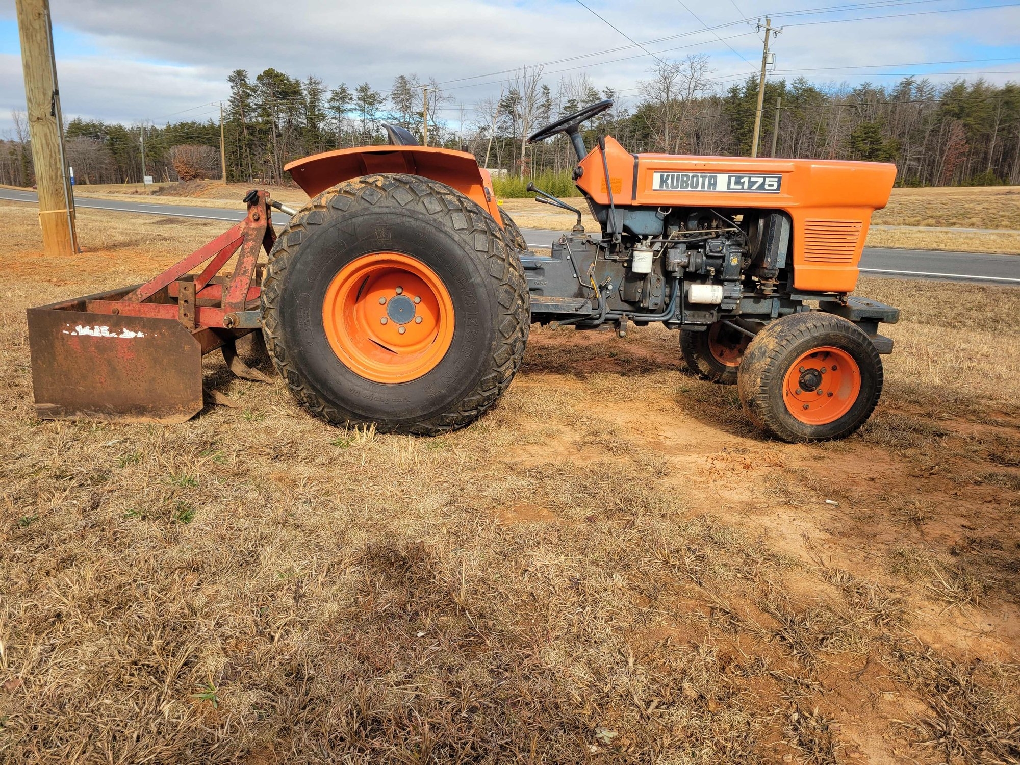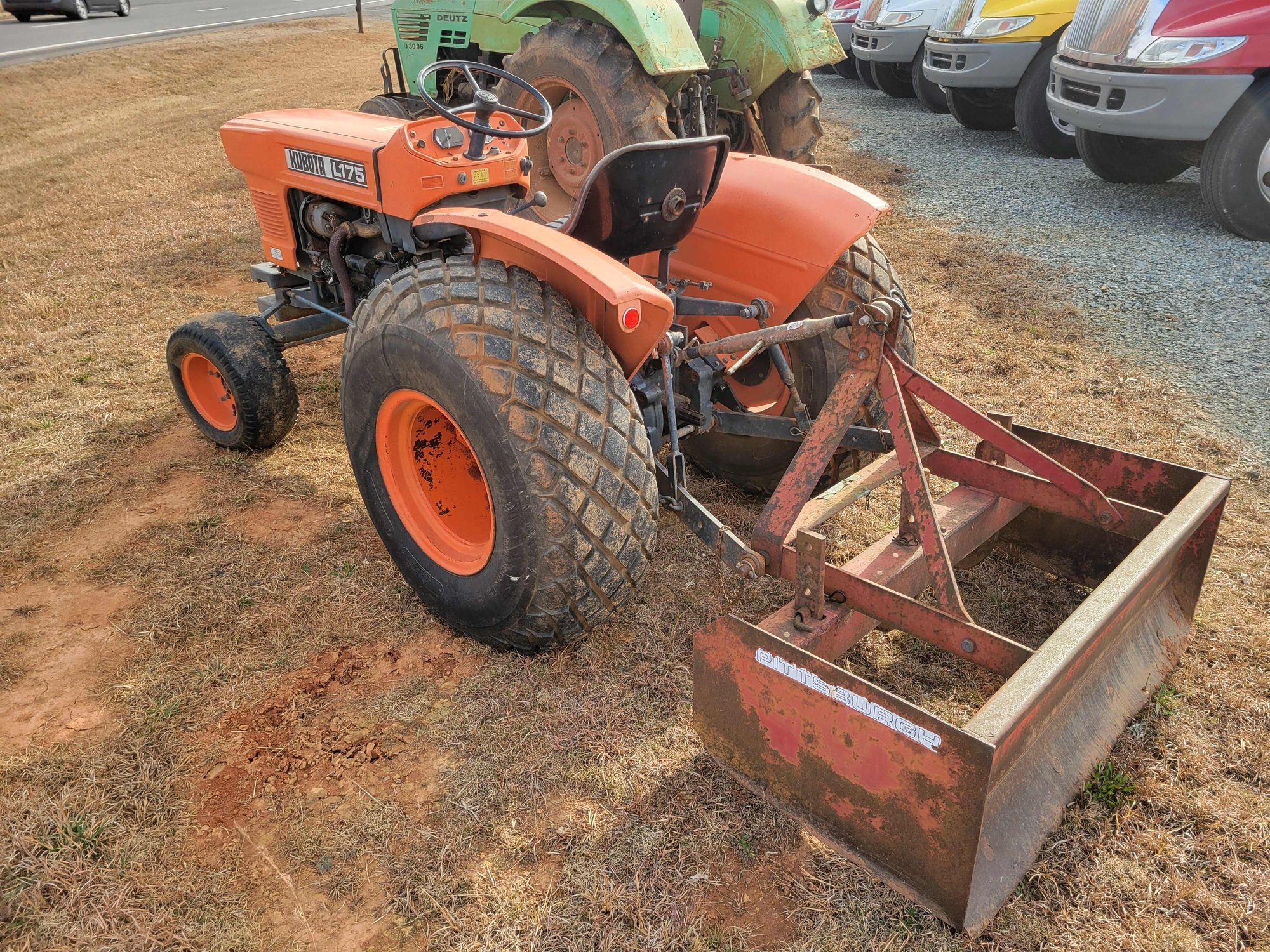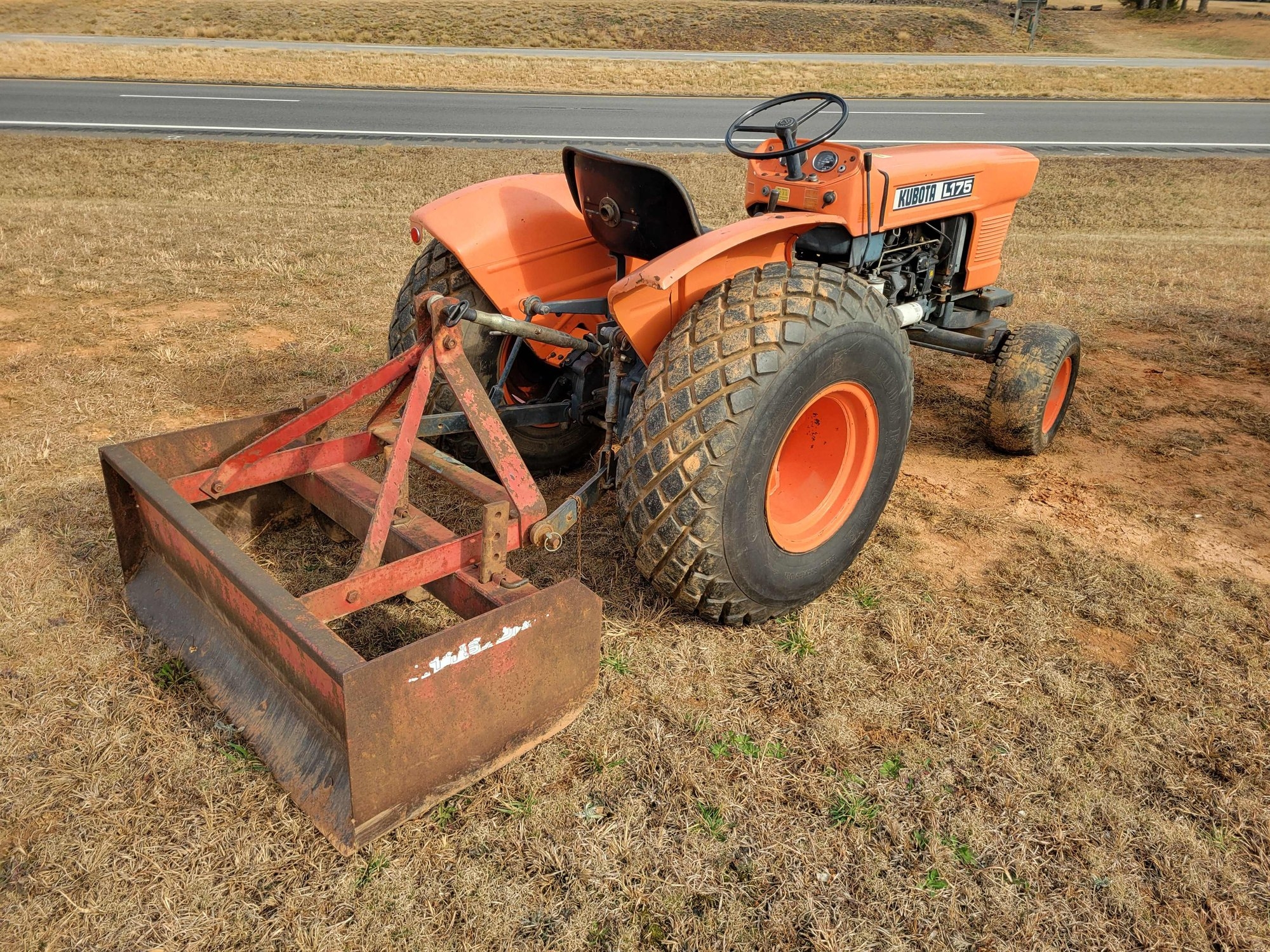 Kubota L175 Tractor, 17.5 hp Diesel Engine, 8 spd Trans, 60" Belly Mower, 4' Pittsburgh Box Blade w/ 3 Adjustable Digger Teeth, 3 Point Hitch, 2109 Hrs. On Meter SN: 12500