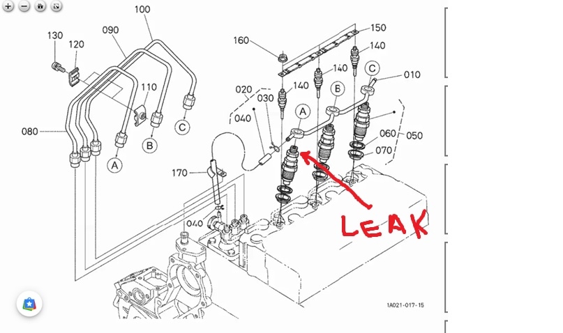 I noticed a drip coming from the tractor and determined that it was diesel. Further inspection led me to the injector nozzle area as the source. Sprayed each nozzle down with brake parts cleaner and as my luck goes the one that leaks goes to the piston furthest from the cab - the one that is most difficult to see and access. As it's cold here in northern MI I wanted to continue inspection in the garage. So I took off the FEL for easier access and then took off the roof panel in order to fit in the garage door opening