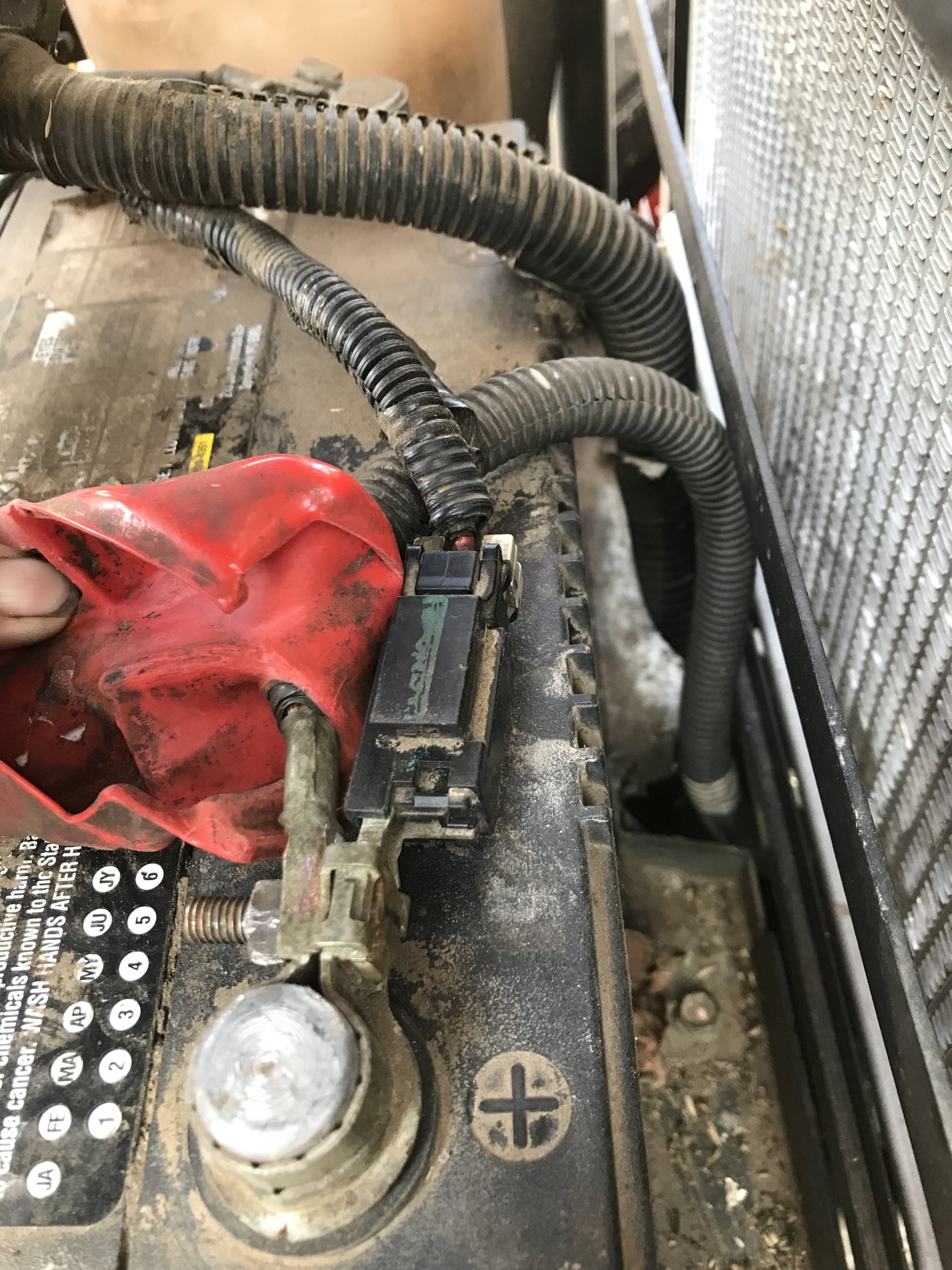 I think he found the problem. The positive battery cable has two wires, the main large wire that goes to the starter and a small wire that is connected with a plug (pictured below). The last two times it acted up he unplugged it and plugged it back in and it started, kinda like it might be vibrating loose. The parts diagram doesn't show that wire and neither does the diagram for the wiring harness so we're not sure where it goes. You said your tractor is similar to ours, I was wondering if yours also has that wire and if so does your WSM show where it goes. The parts diagram only shows battery cable and when I looked up the part number it's $184. Rich was wondering if he could just bypass the plug and connect the wire directly to the battery. Also, I'm going to start a new post, He was driving it home from a field about 3/4 mile from our house he was in high 3rd gear when it somehow jumped into 4WD and locked up the front end and now the 4WD doesn't work. At least it still runs in 2WD so we can still get our jobs done. I'll explain more in my new posting.I reckon I have to agree, put sme garlic on the seat. it might ward off the evil.