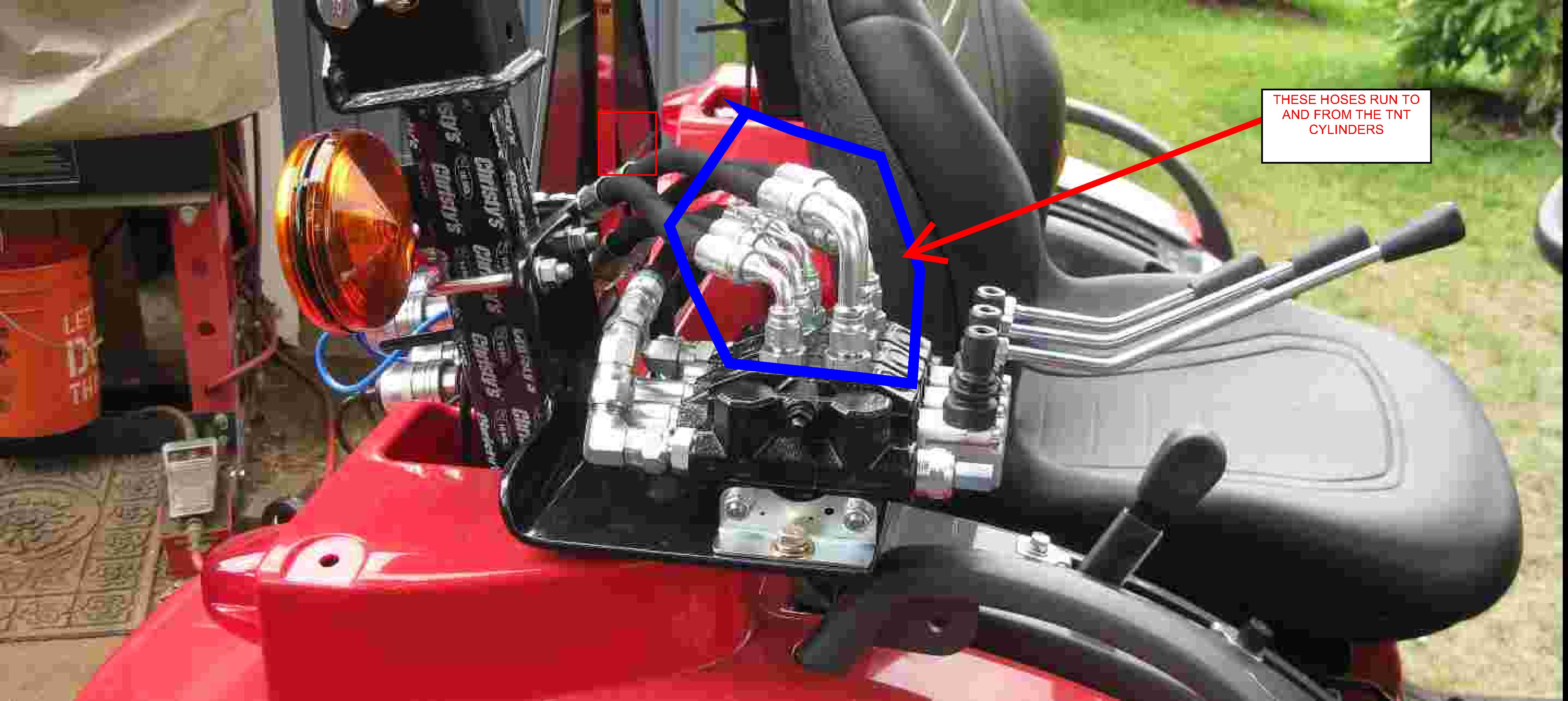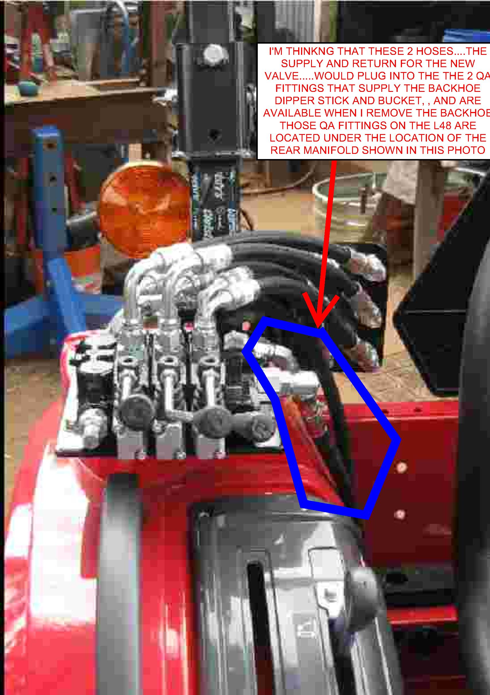 For questions 2,3,&4 you ask: Are you suggesting, that one or both of the hoses going to that FEL remote would be disconnected from the valve, and replaced with a tee?and then the tee would feed both the FEL remote and the new manifold for the TNT in the rear?