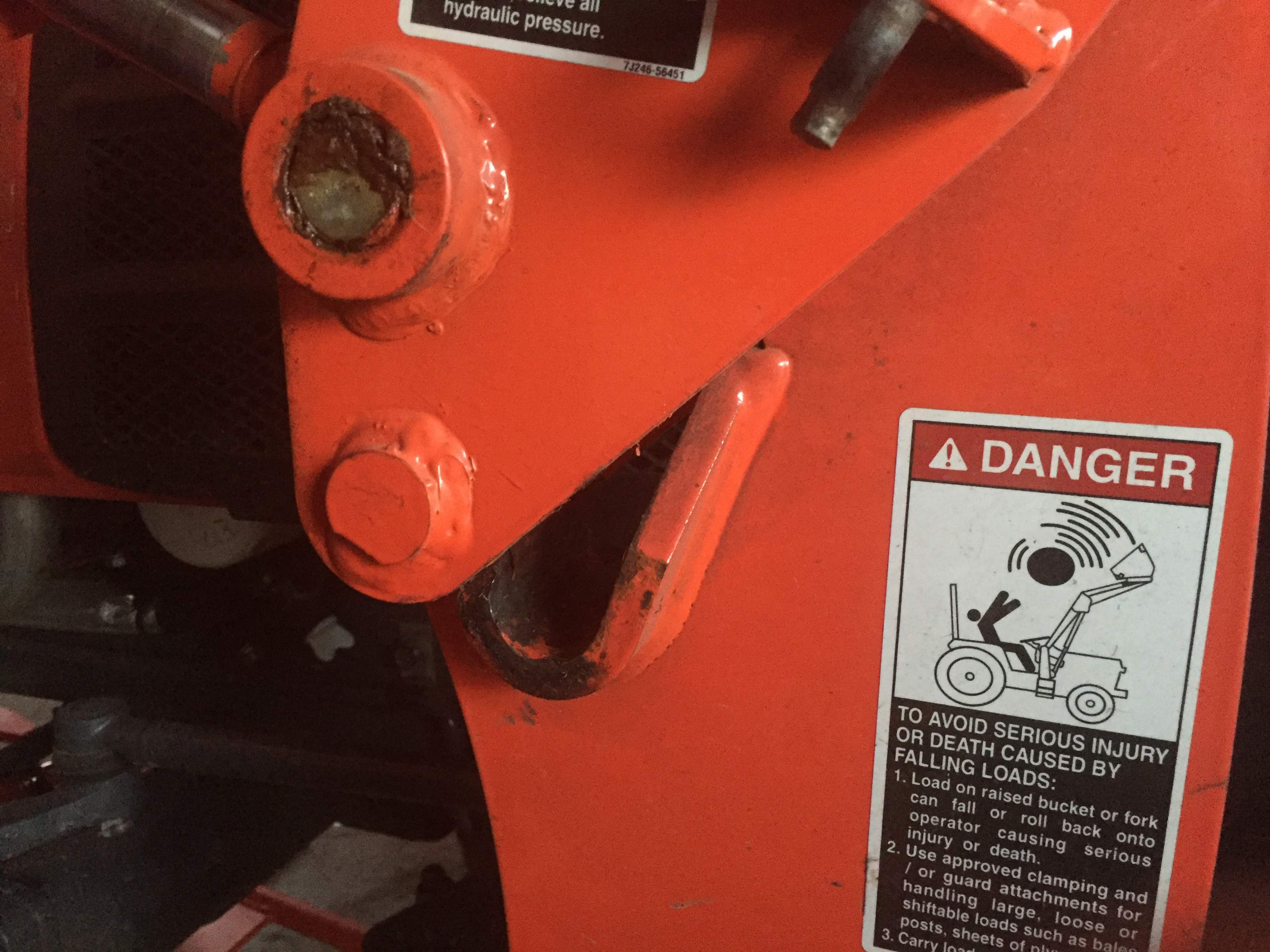 I was putting on my loader this afternoon. I put the left pin in, then I was going to put the right pin in but I was unable to get the holes to line up. Then I looked down where the lower arm sits in the cradle and noticed that the left side was not in the cradle. I can not get the pin out now. As I was trying to realign everything the loader kept going left. Now the loader is crooked. I do not think that I damaged anything except for breaking the headlight lens cover. The loader hydraulic fitting hit the lens. So I need some advice. I think the first thing that I need to do is pull loader straight with the tractor using a comealong or the neighbours loader. As I lower and curl the bucket so that it rests on the dismount skids I think I will need to keep pressure with the comealong/loader. Do you guys think this will work? Have you ever had this happen to you? I am attaching two pics of the lower bracket so you will know what I am talking about. Thanks