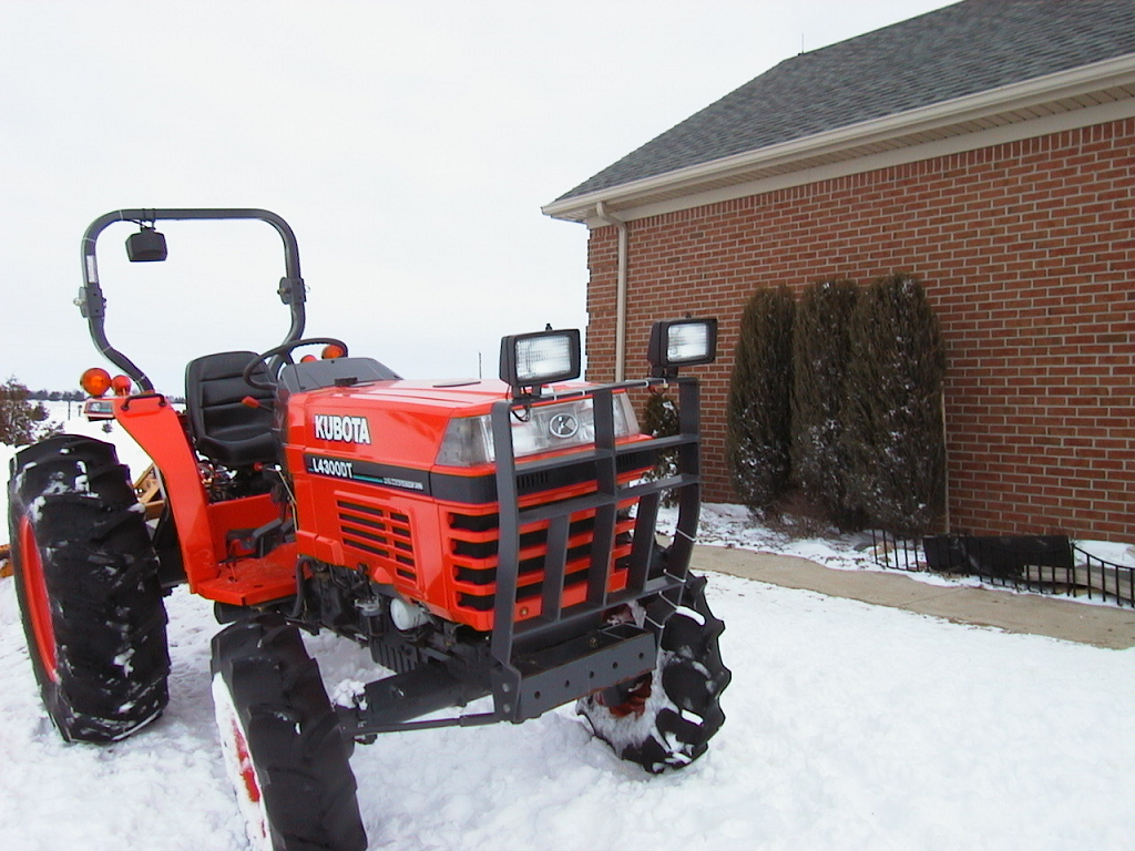 My father has a Kubota M7040 and increasing has to use if after dark. This is mainly for putting out large round bales but also some occasional dirt work and other general farm chores. The tractor is an open station but has a Kubota fiberglass canopy. The canopy has two approximately 1" square tubes running forward from the ROPS supporting it which I plan to use to mount the lights. The tractor has one rear work light mounted on the left fender, and from the above linked threads I know there should be a wire under the right fender I can use to power the new lights. I plan to use an inline switch mounted somewhere on the right fender and then run a wire up the ROPS and to the new lights.