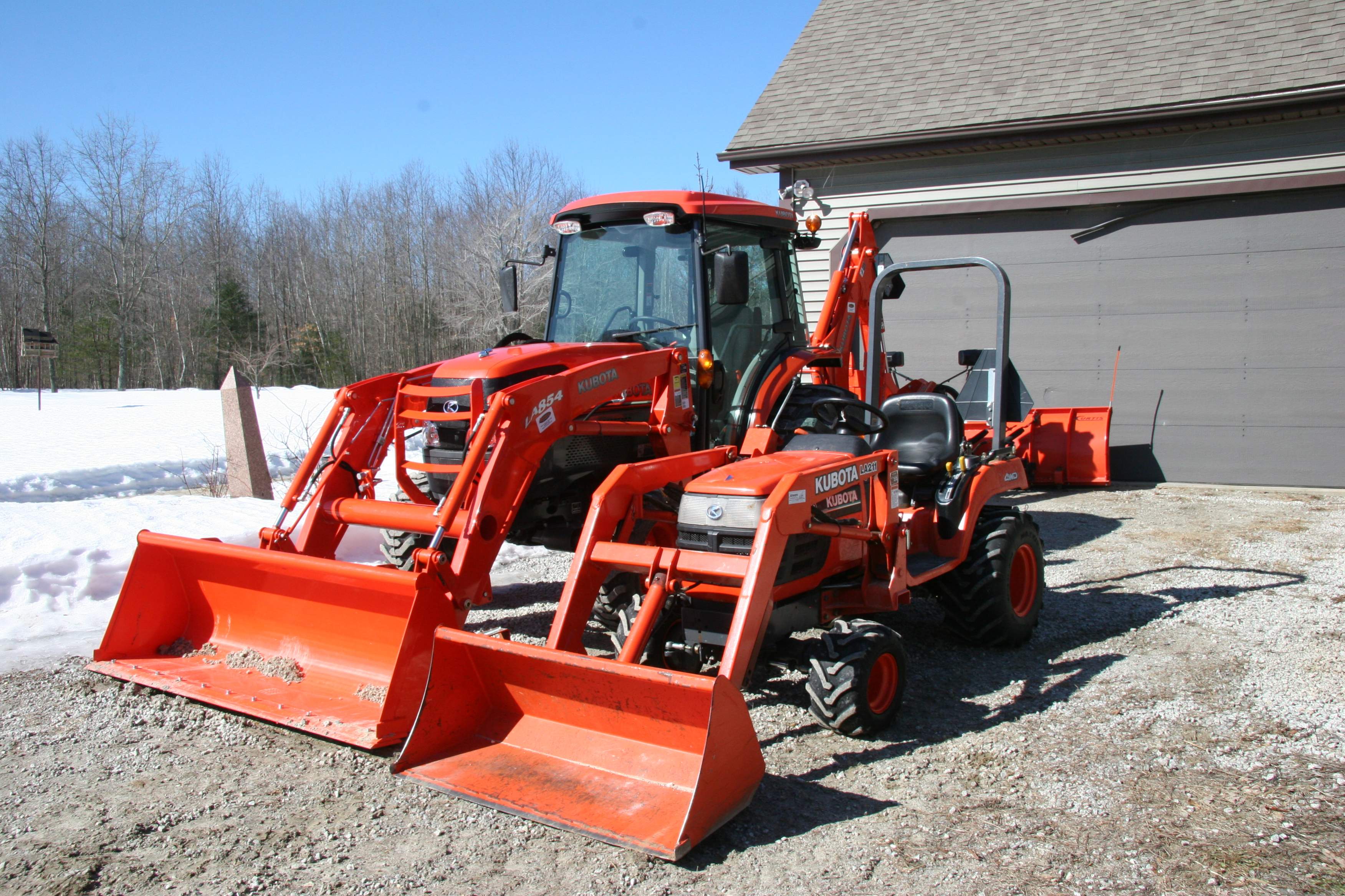 My "orange" family. "Dad" is a BX2200 - my "diesel powered wheelbarrow"/lawnmower. "The Kidd" is an L4740 w/loader and backhoe.IMG_3101.jpg