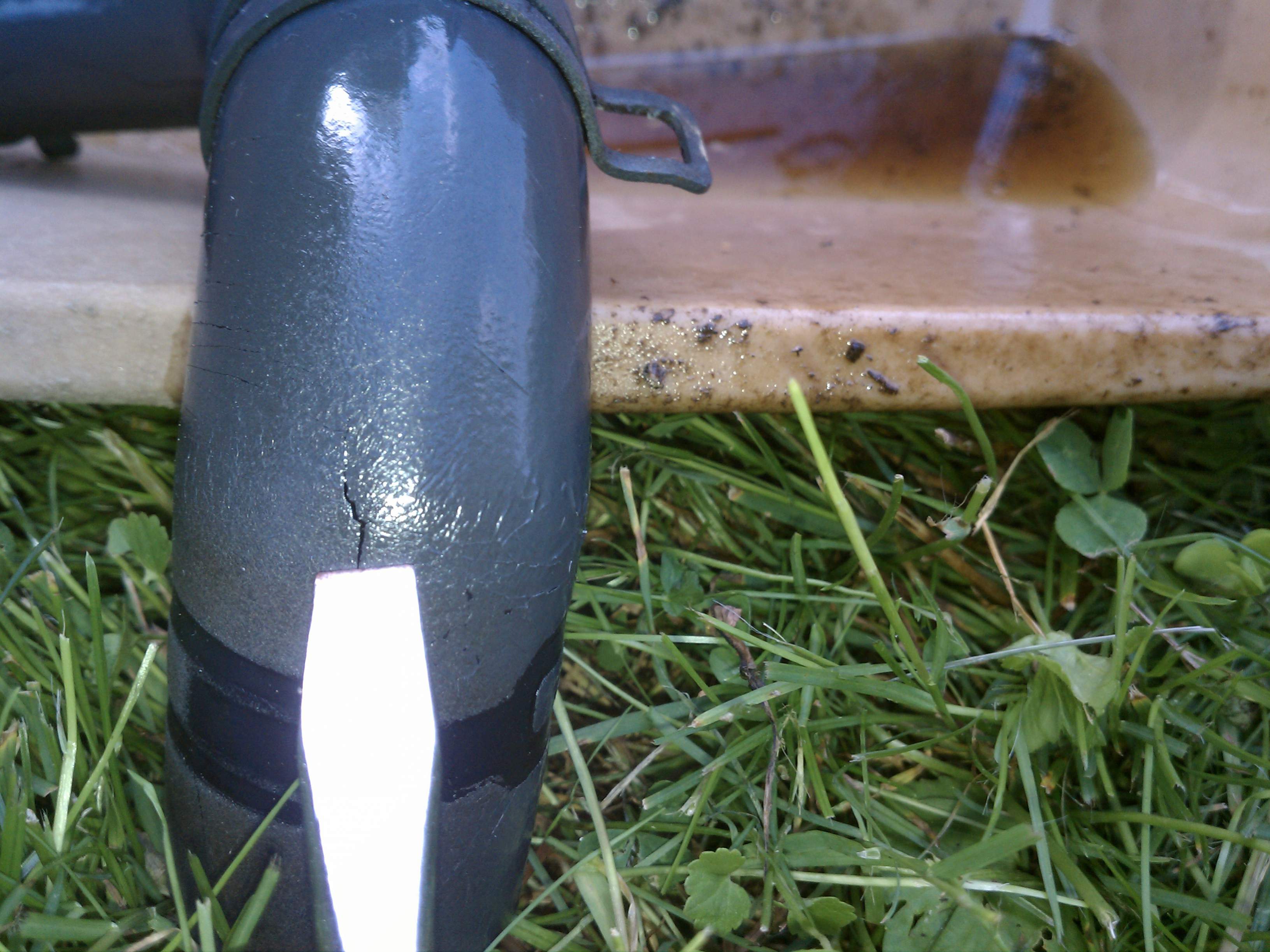 Bought the hose, took about an hour b/c I had to remove two items in the way. Here's a photo of the old hose, crack is just above the screwdriver tip, the fluid I lost is behind in the pan - about 1/4 cup. Runs great now, thanks everyone.