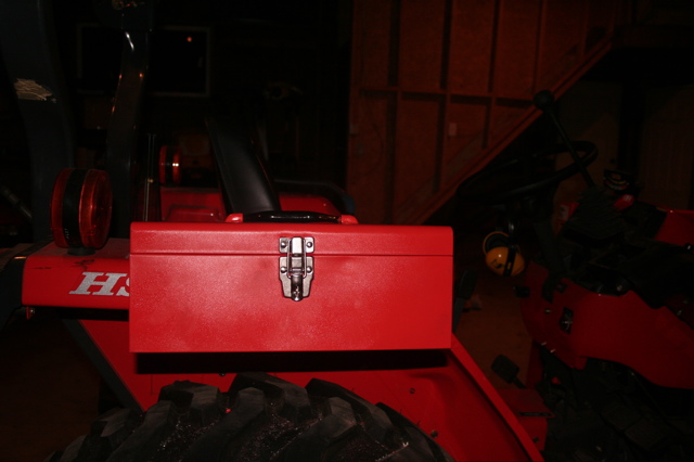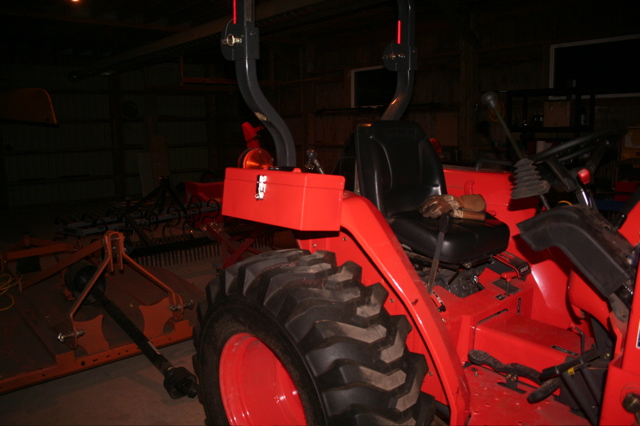 This is a run of the mill metal toolbox I picked up at TSC, painted it Kubota orange. There didn't seem to be a perfect spot for it on this machine so this is what I settled on. It's bolted on well and I don't plan on carrying much weight in it but we'll see how my very first project holds up!